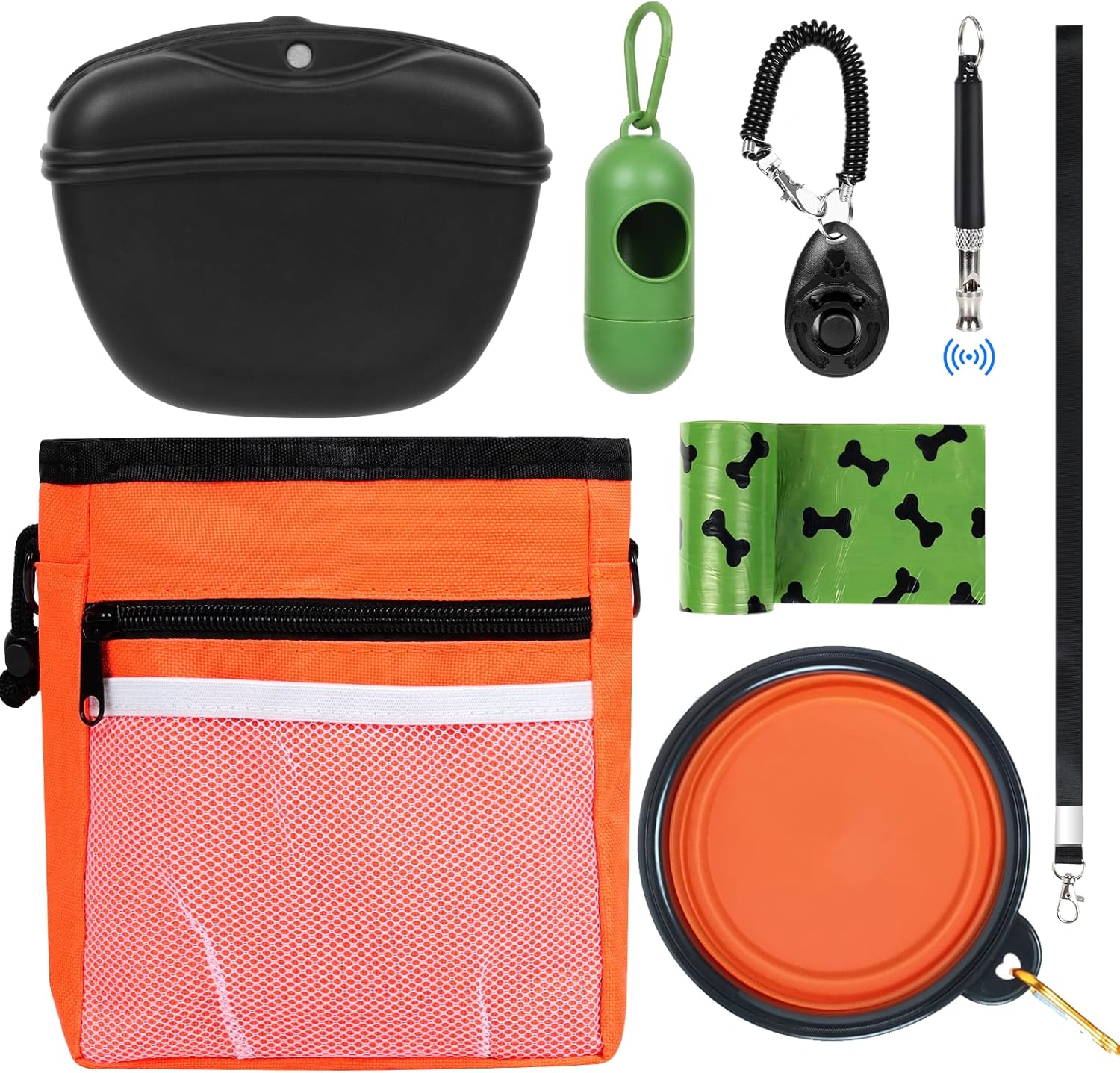 - One Dog Training Kit Meet All Outdoor Needs: Rinwuns dog treat pouch set includes - large treat pouches for pet training x1, water-proof silicone dog treat bag x1, portable dog bowl x1, dog training clicker x1, ultrasonic dog whistle x1, dog waste bag rolls x1, poop bag holder x1 and an adjustable leash that can be used as a shoulder strap or a waist belt. This dog walking fanny pack kit is a tools aid essentials for go out