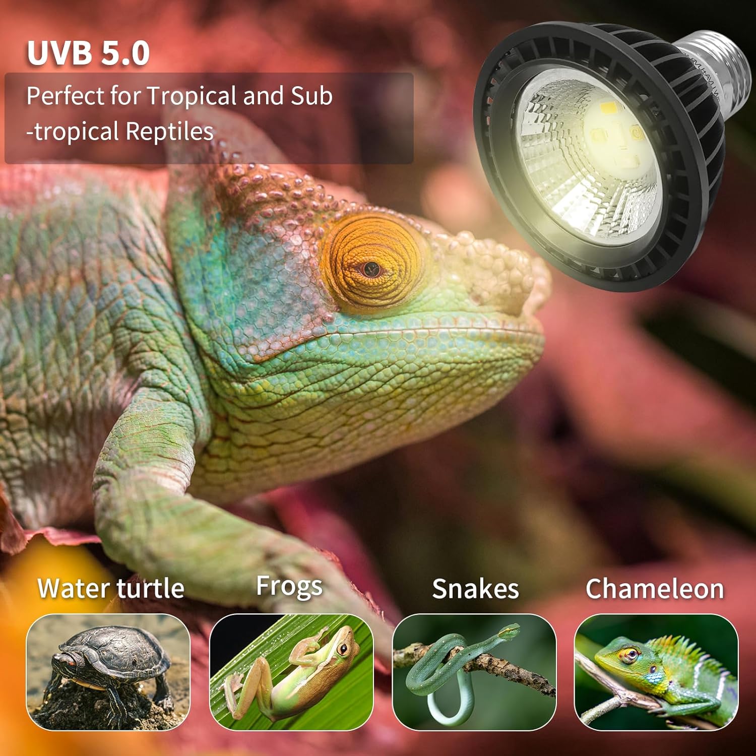 - Suitable for tropical rainforest reptiles: The UVB 5.0 reptile light bulb is suitable for tropical rainforest reptiles, including iguanas, chameleons, lizards ,snake, frogs, toads and tortoise. Taking a few hours of UVB light every day can greatly enhance the vitality of reptile pet crawling and prevent and treat diseases.