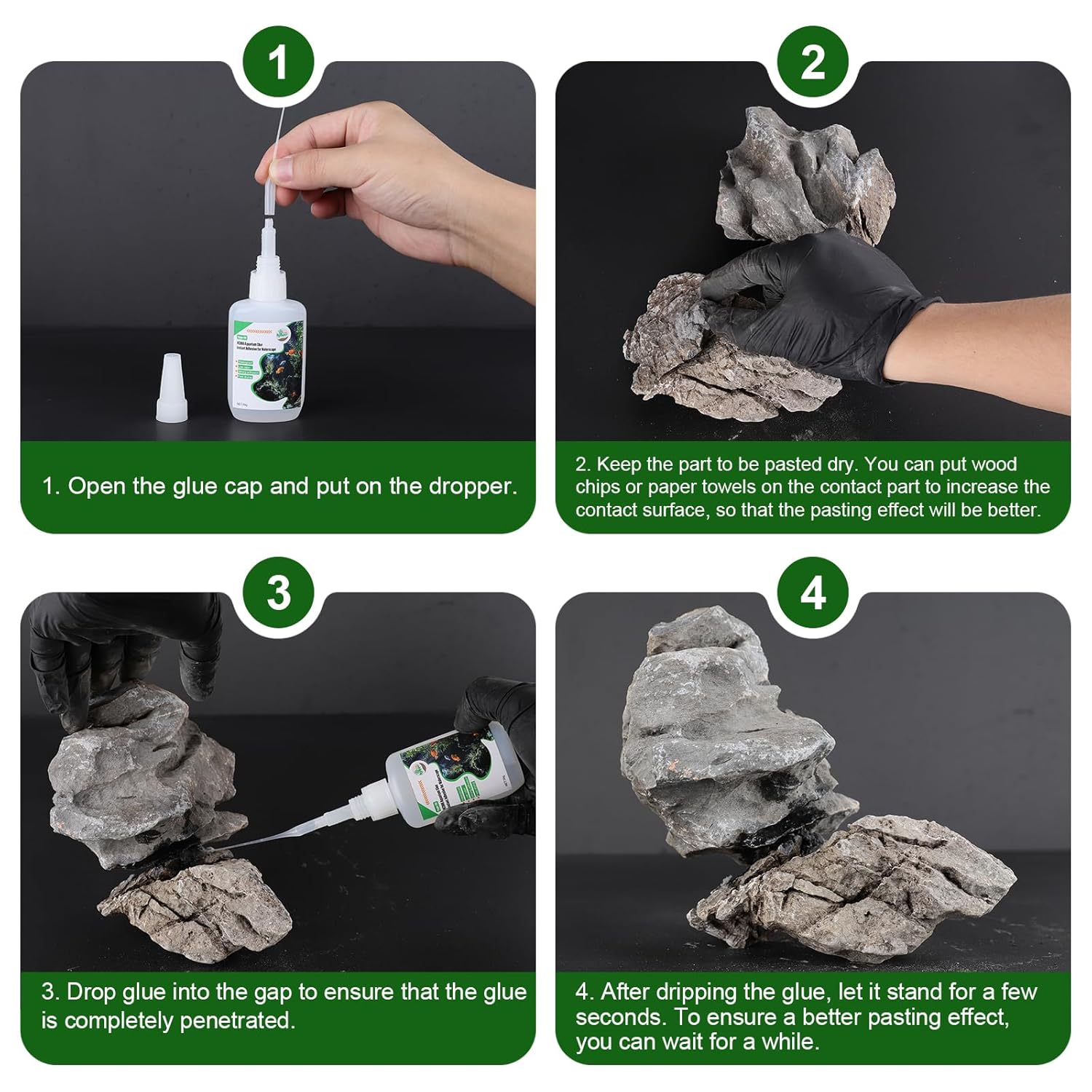 - Tips: This glue is in liquid form and cannot be used underwater. When using paper towels or wood powder as a medium for gluing driftwood or stones, the effect will be better. In addition, the glue will smoke during the curing process. Be careful to avoid being choked by smoke and irritating your eyes. Just wait for a few seconds. After curing, it is colorless and odorless, and there is no other effect. It is best to wait 24 hours before putting the bonded product into water, so that the effect is best.