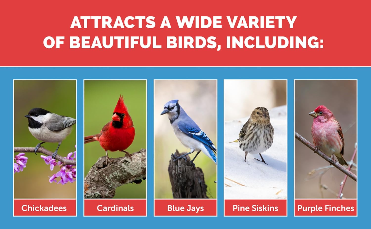 - Attracts Cardinals, Chickadees, Goldfinches, Grosbeaks, Nuthatches, Woodpeckers and much more