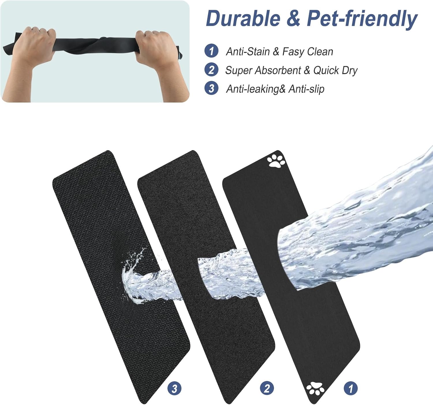 - Pet Feeding Mat:absorbent dog mat for food and water bowl,no stains quick dry dog water dispenser mat,dog accessories pet supplies,dog water bowl for messy drinkers,this pet food mat can prevent liquid from overflowing. super absorbent and quick-drying ability to avoid wetting pet paws even for messy drinkers. sturdy dog & cat food bowl mat cannot be torn easily and avoid eating by mistake. keep the pet's eating environment tidy and clean.