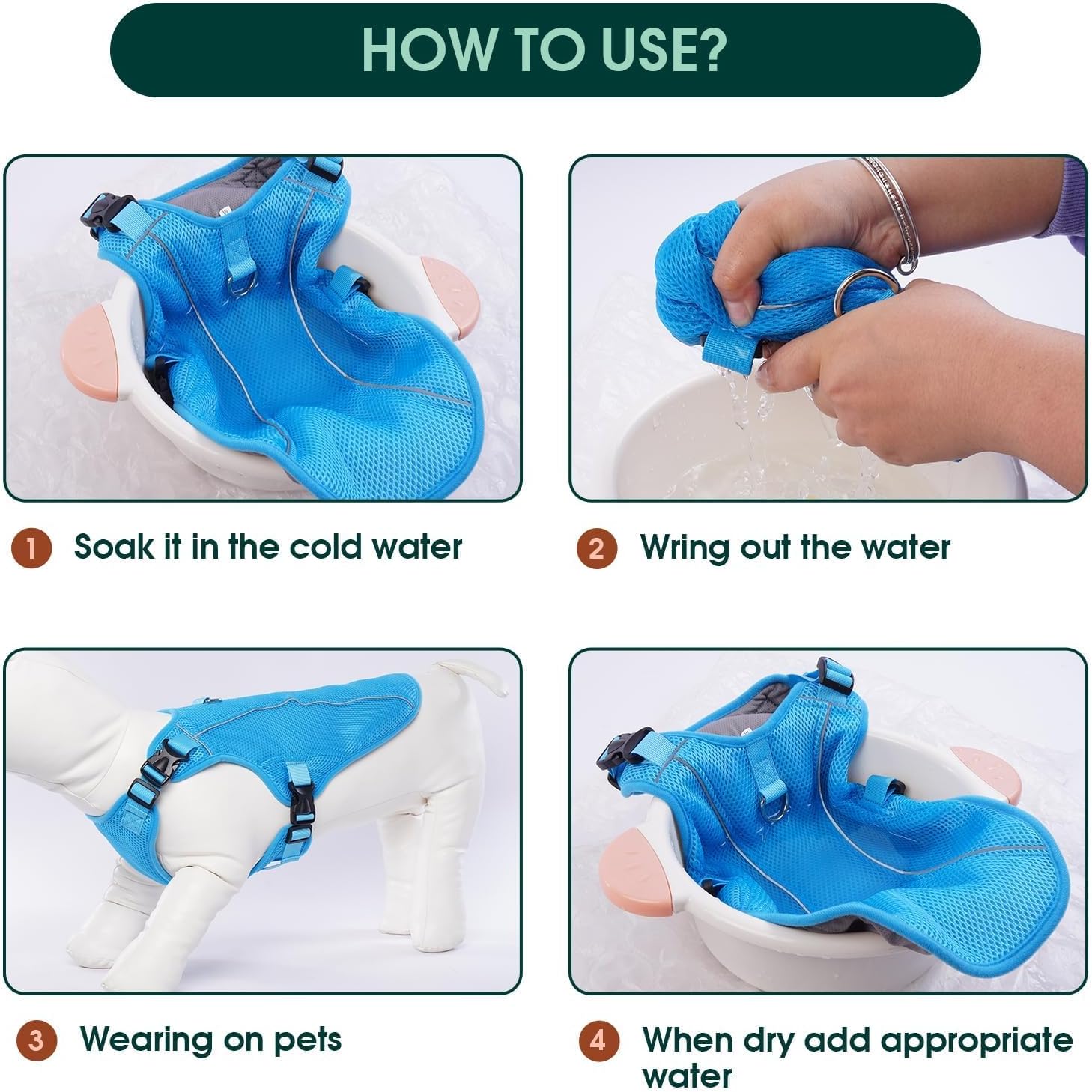 • HOW TO USE: Simply soak the cooling undershirt in cold water, wring it out and put it on your dog. As the vest gradually evaporates, it lowers your dog's body temperature and provides a soothing cooling effect. By using this cooling vest, you can greatly reduce your dog's risk of elevated temperatures and heat-related problems
