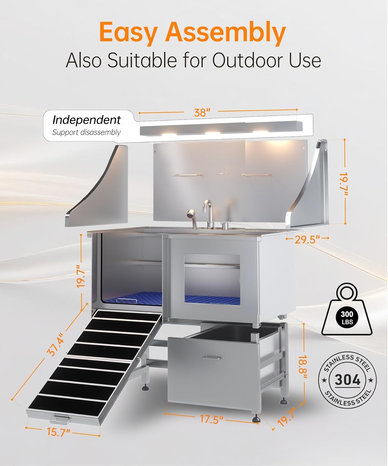 - Innovative and Practical Design: The POLIMO dog grooming station features multiple outstanding design elements: ① IP65 Waterproof high-brightness LED spotlight. ② Grade A tempered glass observation window. ③ The bathtub’s side panels feature a curved slide design, making it easier to operate④ Two-piece floor grid, adjustable to three different heights. ⑤ Sliding storage drawer for organized storage. ⑥ Multi-function faucet and showerhead, adjustable to left, center, or right positions.⑦ Two drainage options are available: one with a pet hair catcher and another stainless steel drain pipe featuring an odor-blocking S-trap design