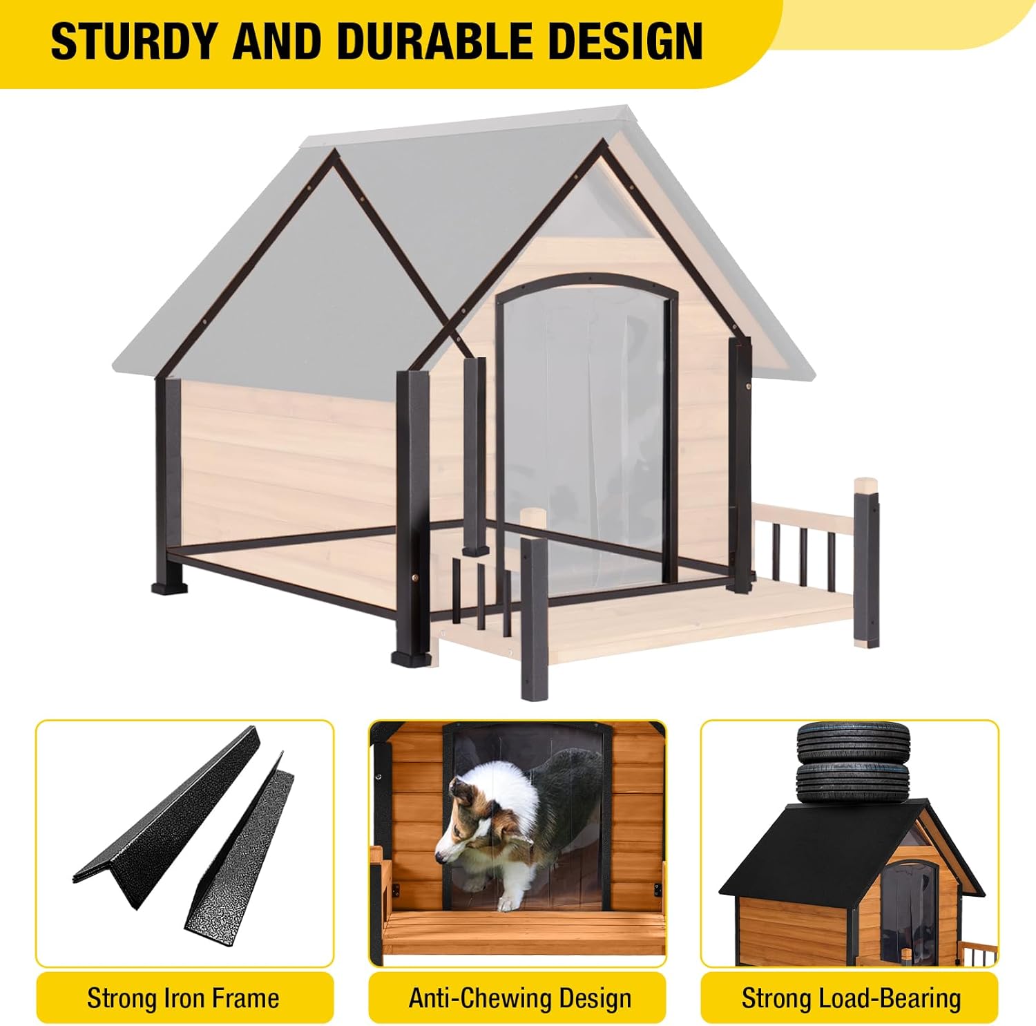 - Raised Platform: The elevated floor protecting your dogs from moisture. The open door has a vinyl curtain help eliminate drafts and provide better air flow