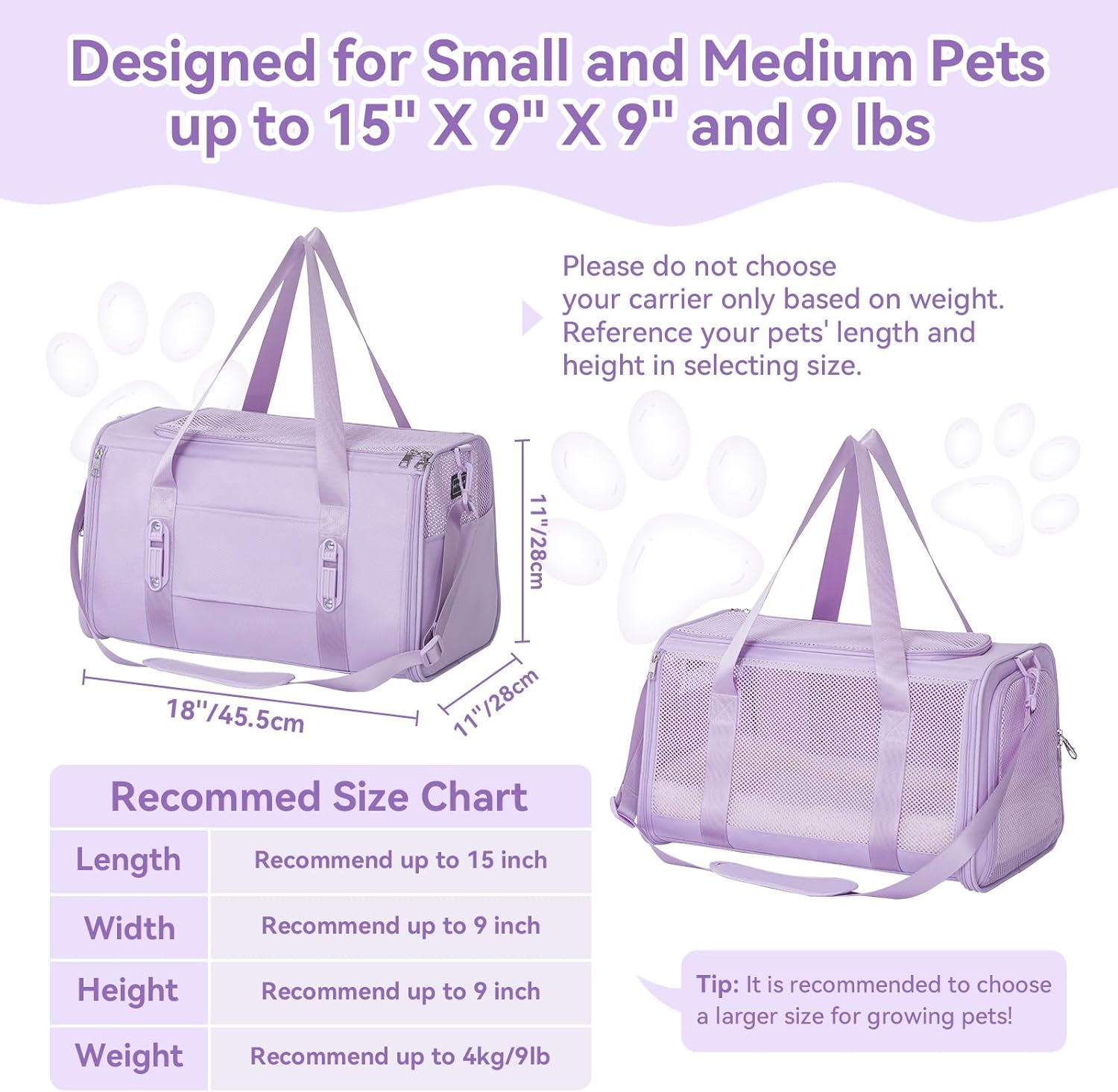 - Airline Approved: To fit under airline seats, airlines only allow small dogs and cats. We recommend tsa approved pet carriers for pets measuring 18”L x 11”W x 11”H and weighing under 9 lbs. Before purchasing, please check the size. Do not choose your carrier only based on weight. Reference your pets' length and height in selecting size