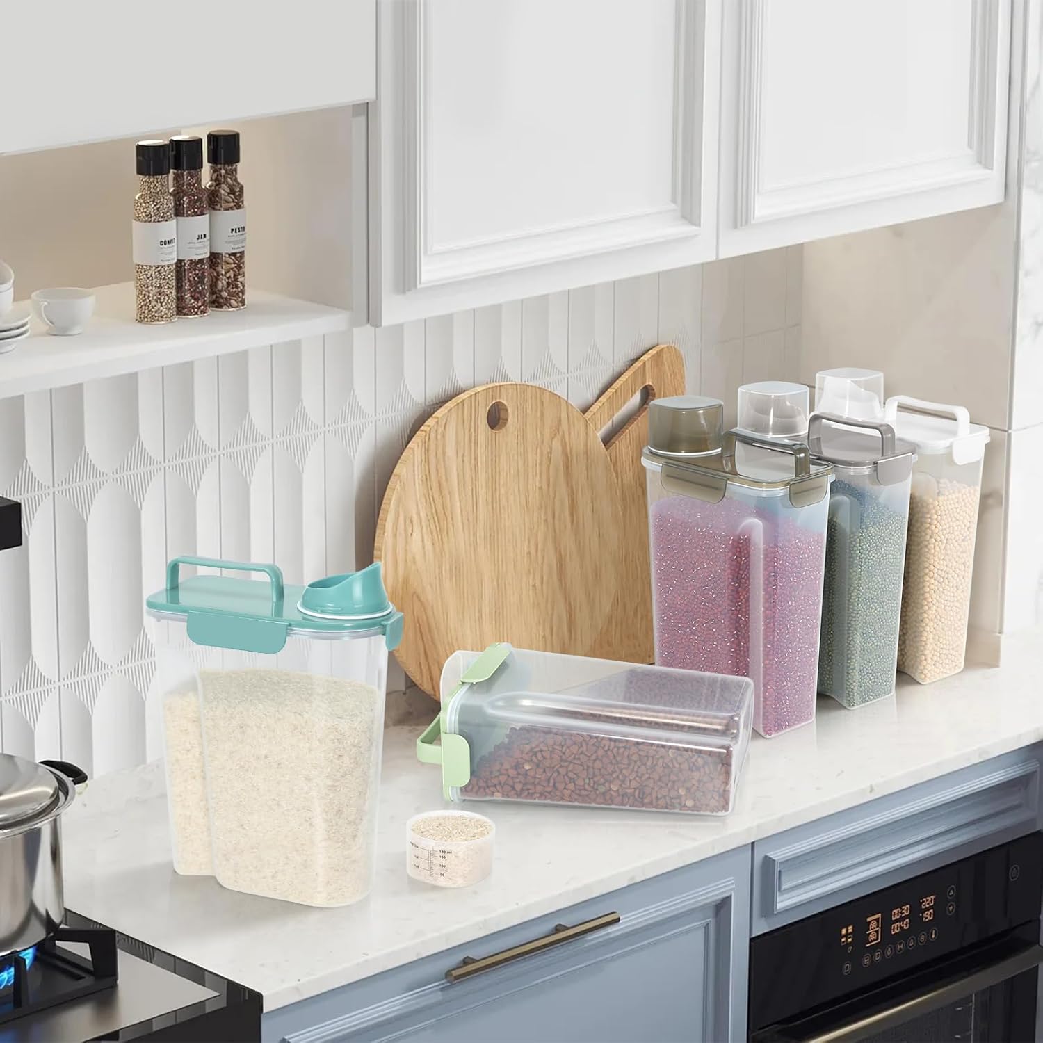 - MULTI-PURPOSE STORAGE : Our pet food container is suitable for storing dog food、cat food、bird seed、fish food、rice、 dry food、cereals、oats、flour and other large and small grains, as well as washing powder used at home. It is also a good choice.