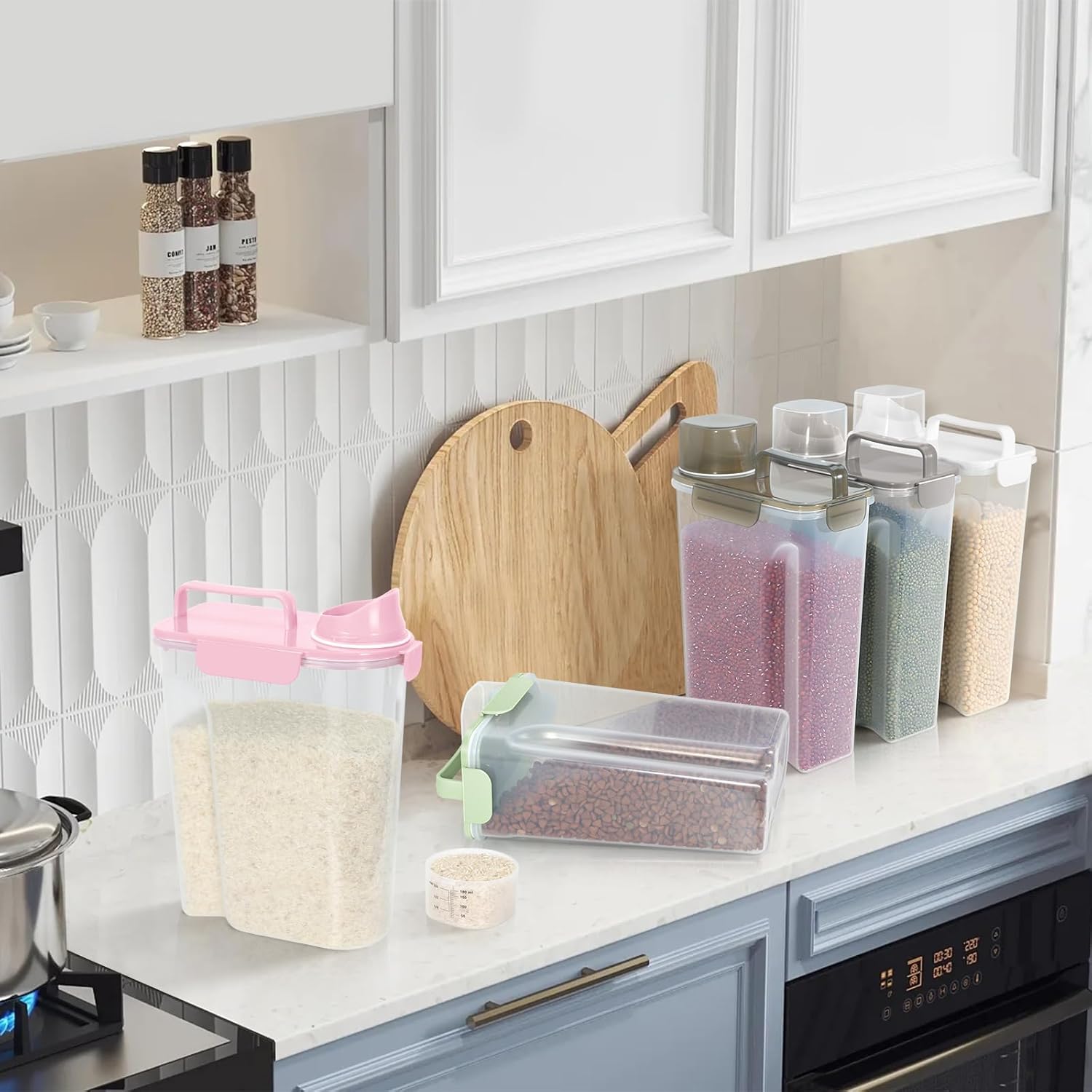 - MULTI-PURPOSE STORAGE : Our pet food container is suitable for storing dog food、cat food、bird seed、fish food、rice、 dry food、cereals、oats、flour and other large and small grains, as well as washing powder used at home. It is also a good choice.