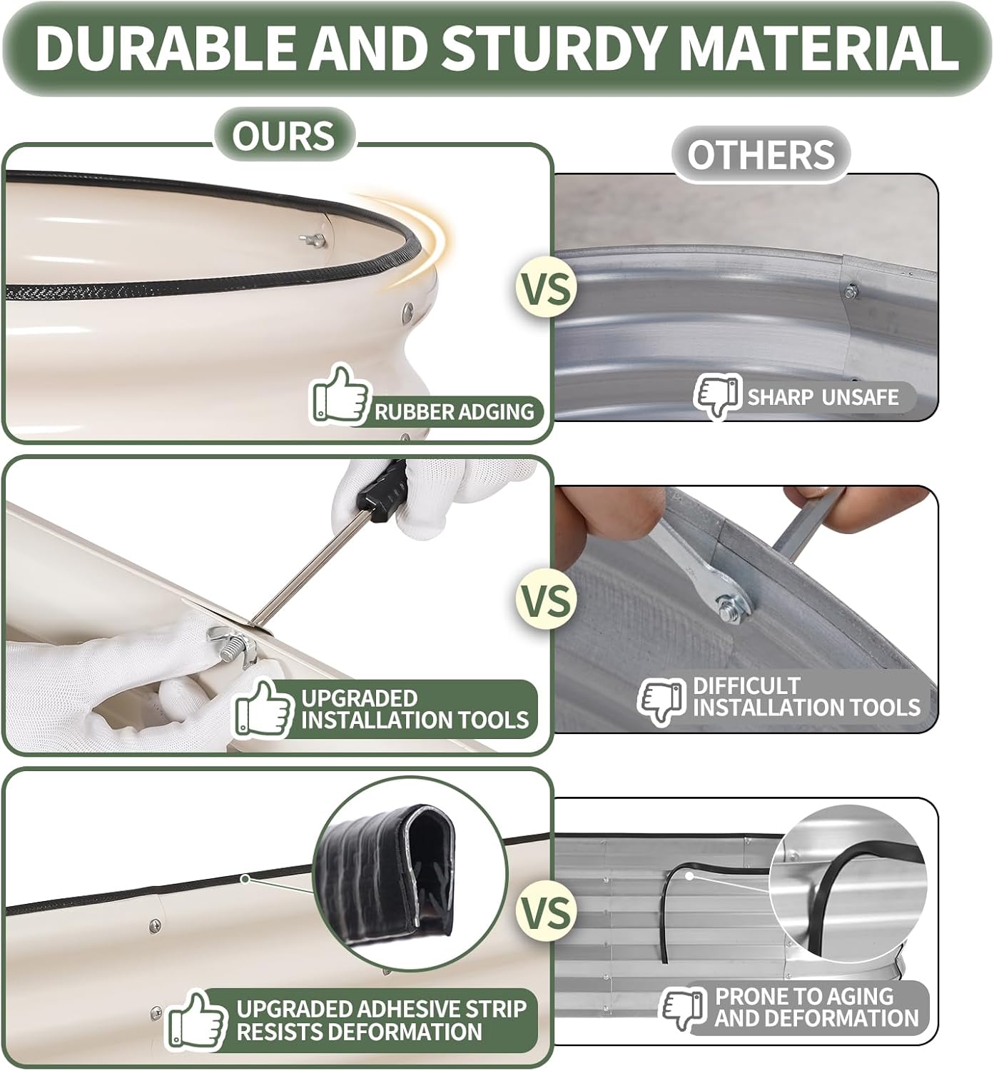 - 【Safety Edge Design & Durable Rubber Strips】The garden bed's top and bottom edges are folded to eliminate sharp edges, ensuring safety from all sides. Rubber strips add extra protection and cushioning, with built-in patches for durability. The galvanized planting box offers the perfect solution for creating your ideal vegetable garden. With the 1More raised bed, enjoy a worry-free gardening experience, prioritizing your safety and convenience. The ultimate choice for a hassle-free and enjoyable gardening experience