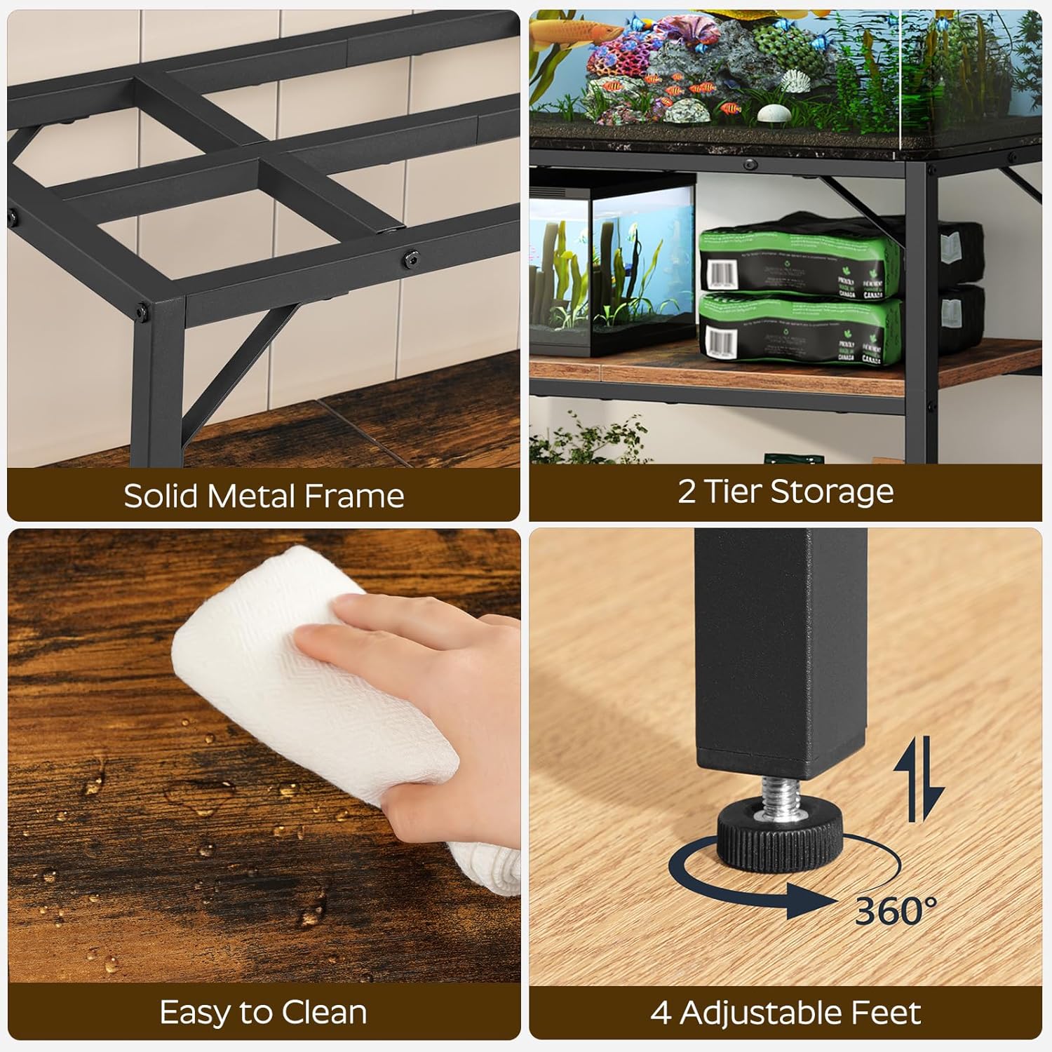 - Maximizes Space: The 2-tier aquarium stand makes the most of vertical space. The top fits up to 40-50 gallon tank, while the middle for smaller tanks, fish food, cleaning tools, etc. The bottom offers ample room for fish accessories to keep everything neat and tidy