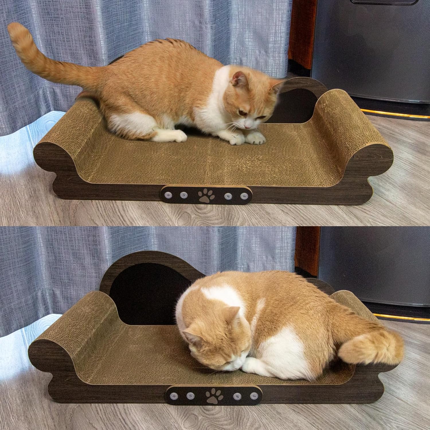 - THICK AND SOLID: the cat scratcher couch made of high-quality cardboards with solid structure is safe and comfortable for cats to rest or scratch, we use thicker cardboards to ensure that cats can sit more stably on his/her exclusive couch, and it is close enough to the ground that you won't have to worry about rolling off.