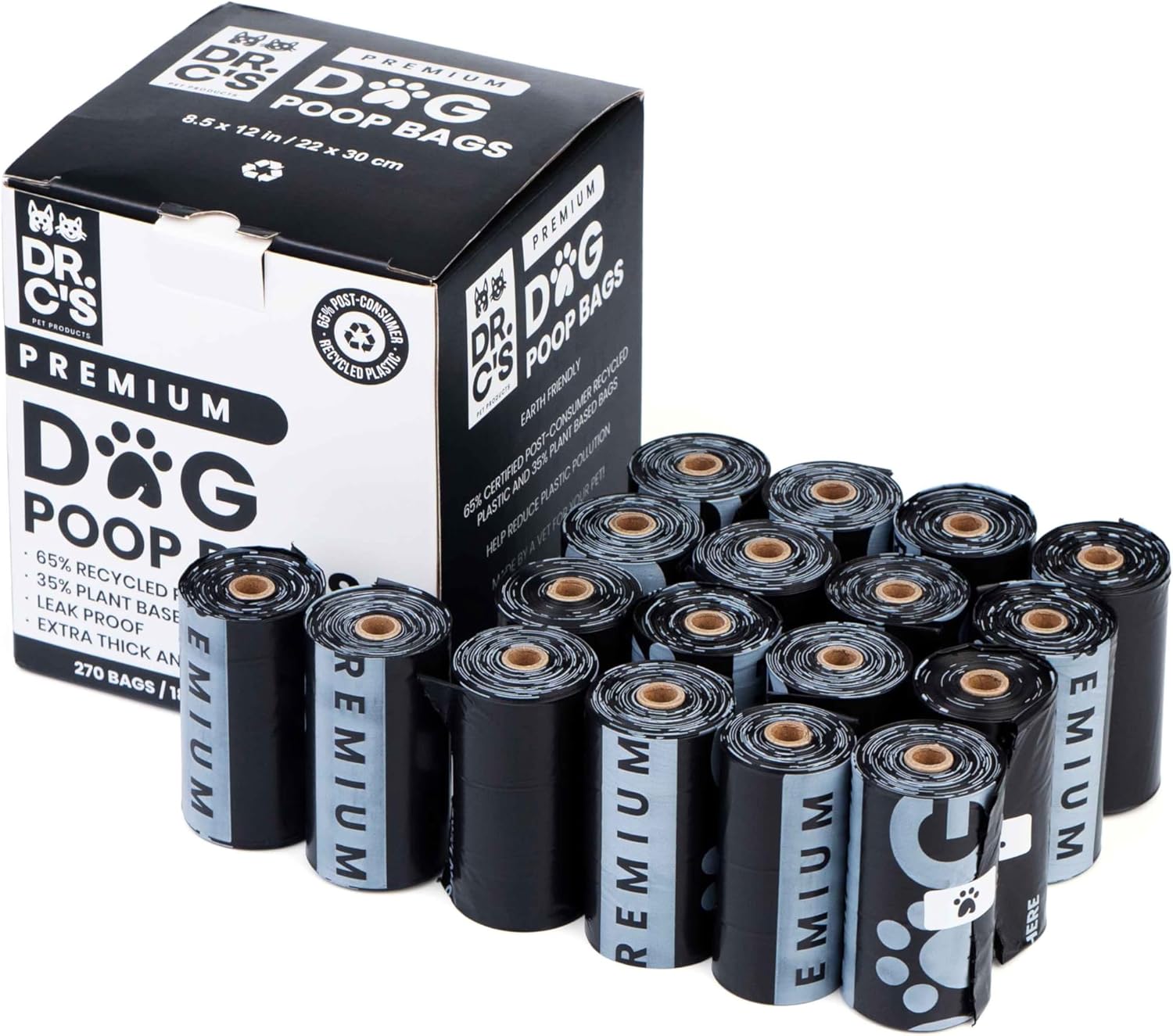 - 🌎 EARTH FRIENDLY: These Dr. C's Premium Dog Poop Bags are 65% post consumer recycled plastic and 35% plant based. No virgin (new) polyethylene (plastic) made/used. Our packaging and cores are made out of recyclable cardboard.