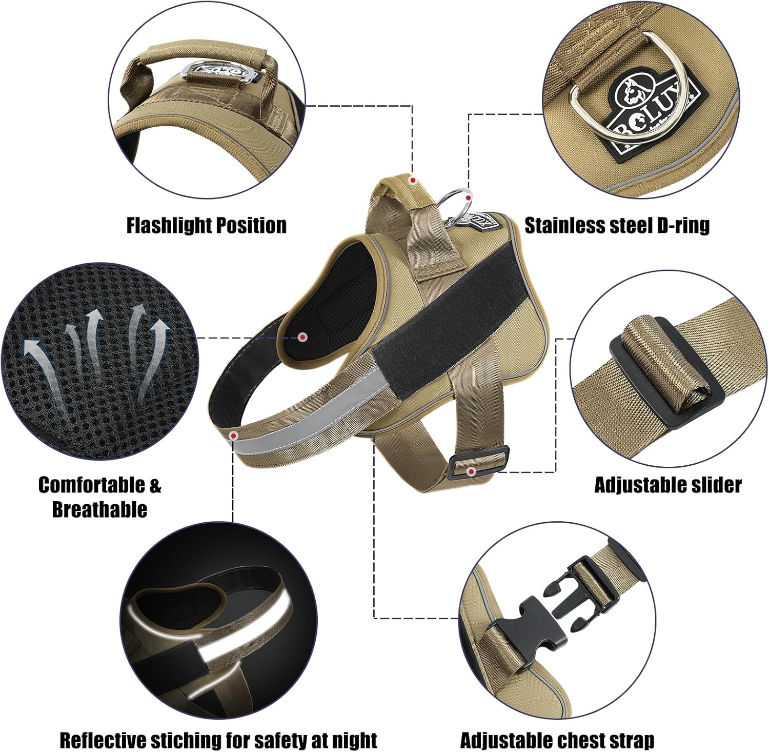- OUTDOOR HEALTHY: Puppy no pull dog harness with reflective straps to ensure your dog is highly visible and keep dogs safe at night. You can connect the dog leash on the D-ring and with handle is easy to control on crowded streets. The high-end pet harness is perfect for daily walking, running, hiking, training, hunting, outdoor adventure and more!