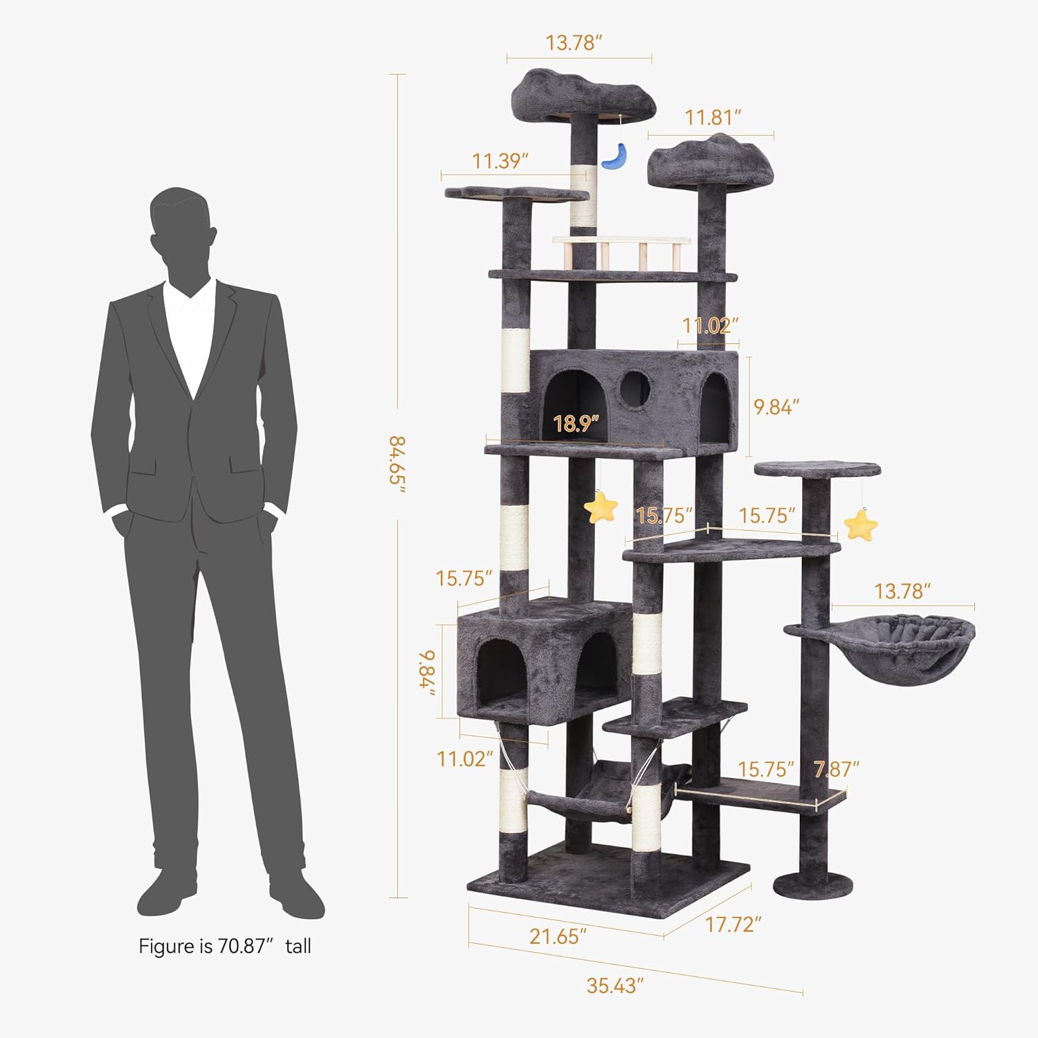 - 【All-in-one Cat Playground】This extra large cat tree provides various features to satisfy your cat's needs. It includes sisal rope-covered scratching posts for different scratching habits, a multi-level climbing cat playground designed for multi-cat households, plush toys for interactive play, two soft cat condos to hide in,and two different hammocks for resting and sleeping