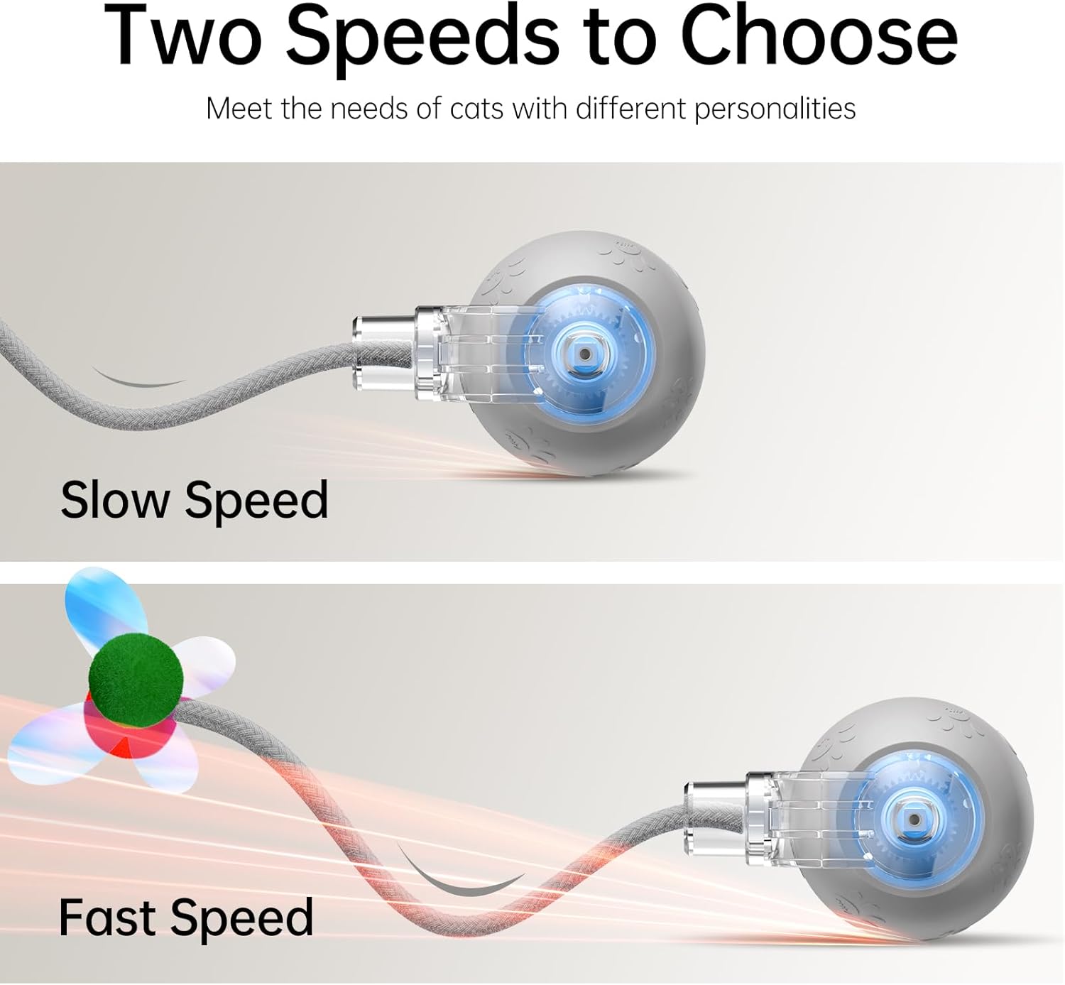 • 【Unique Interesting Tails】 The interactive cat ball toy is equipped with a long rope tail and a furry ball, moving quickly and irregularly like an agile mouse. The unpredictability of the Speedy Tail 2.0 cat toy enhances cats' hunting instincts and accompanies bored indoor adult cats.