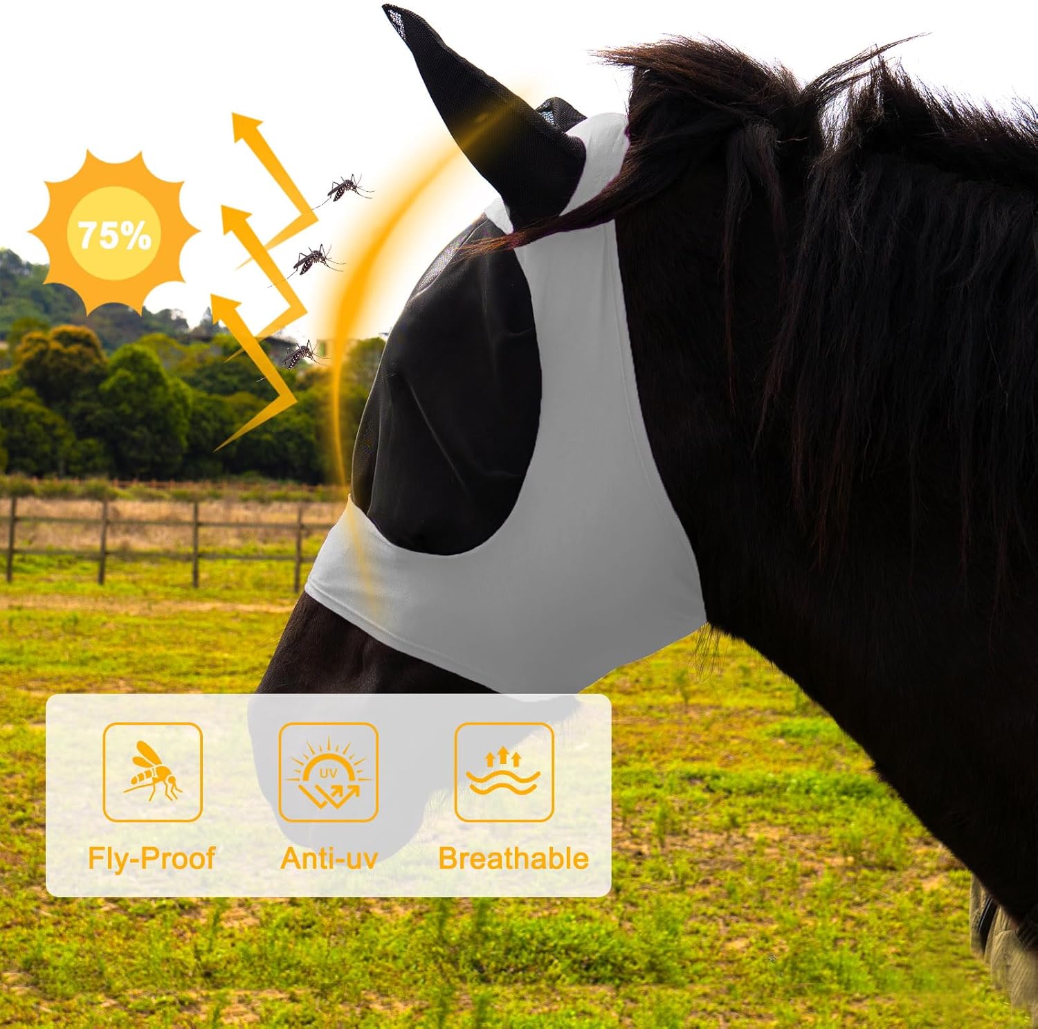 • PROTECTION: Full-coverage mesh horse fly mask shields your horse's face, eyes, and ears from harmful UV rays, dust, and pesky insects