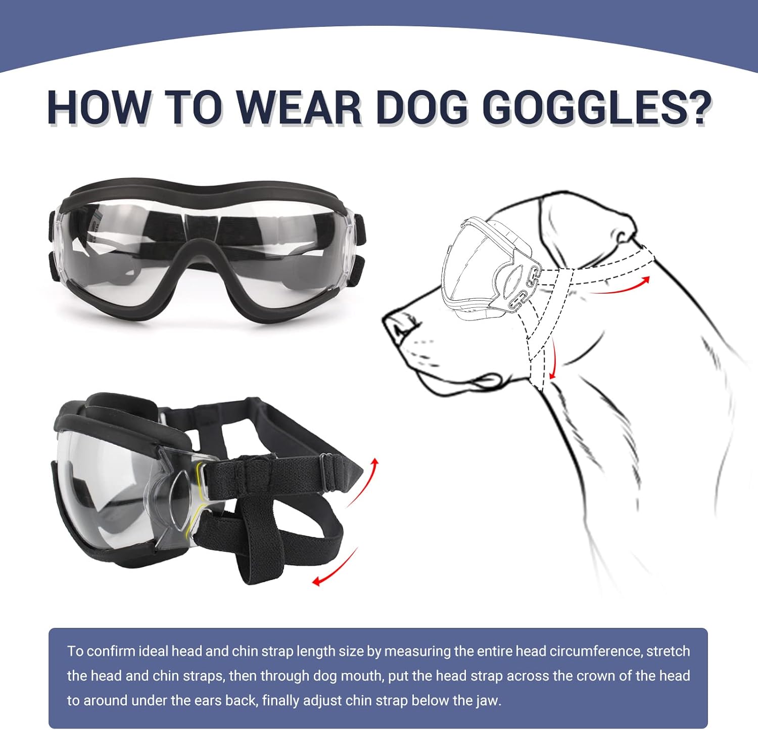 - Note: Please measure your pet's head circumference and chin size before purchasing to avoid size mismatch after purchase. It usually takes some time for the dog to adjust, and you can distract him with treats until he gets used to wearing the sunglasses for dogs