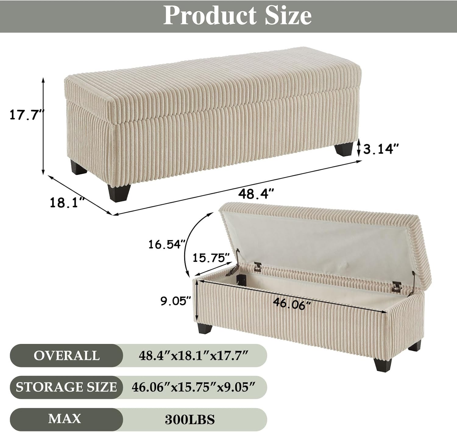 - Solid Build for Stability: Constructed with a durable wooden frame and sturdy legs, this end of bed storage bench for living room provides reliable support, comfortably holding up to 300 lbs for daily use. Product Size: 48*18*18 inch.
