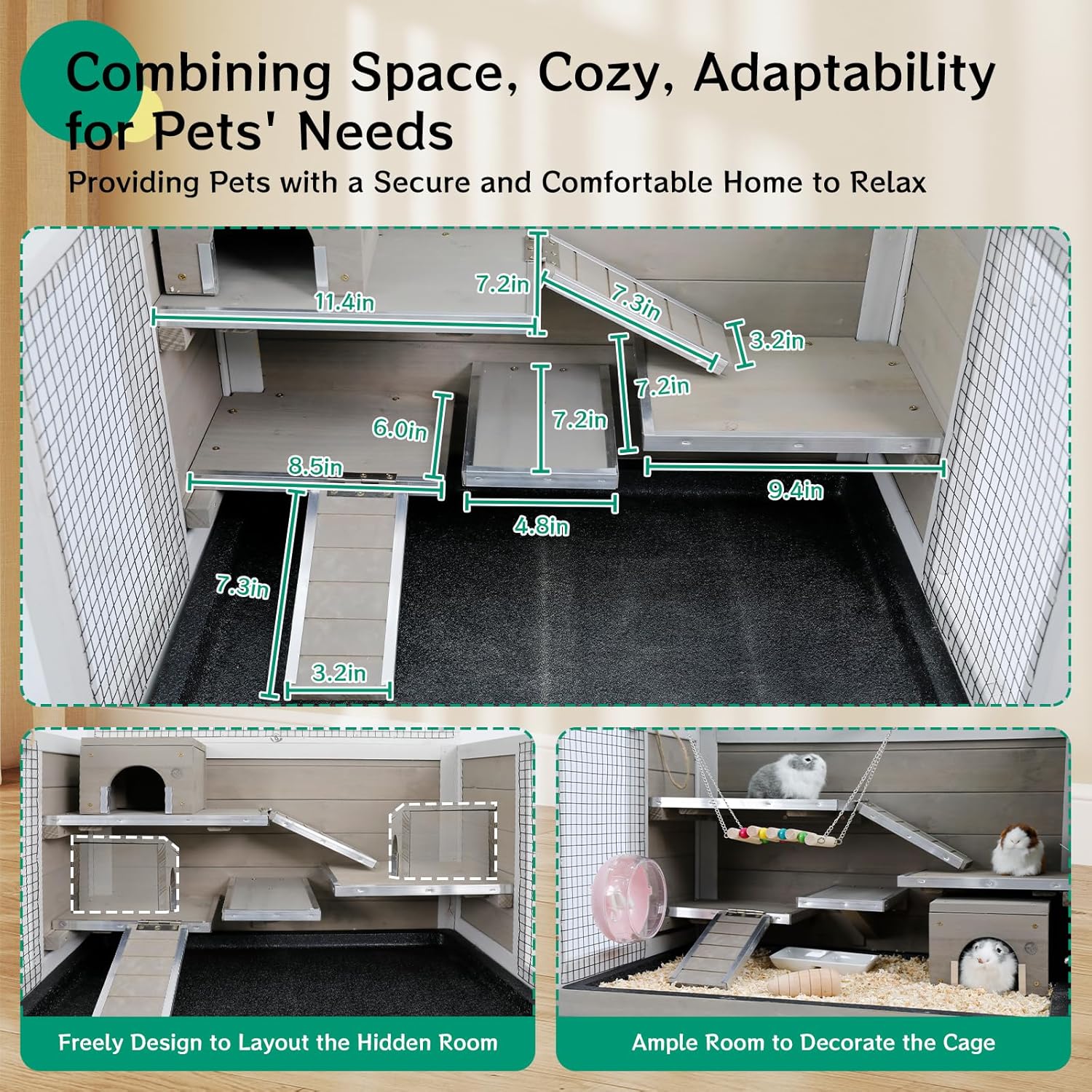 - 3-Level Hamster Cage with Vertical Activity Spaces: 4 platforms at various heights and 3 levels, offering ample space for small animals to living.The metal-framed ramps not only anti chewing but also enchance use. Additionally, the hidden house offering both cozy houses and secure hiding spots,also can be move anywhere as you want.