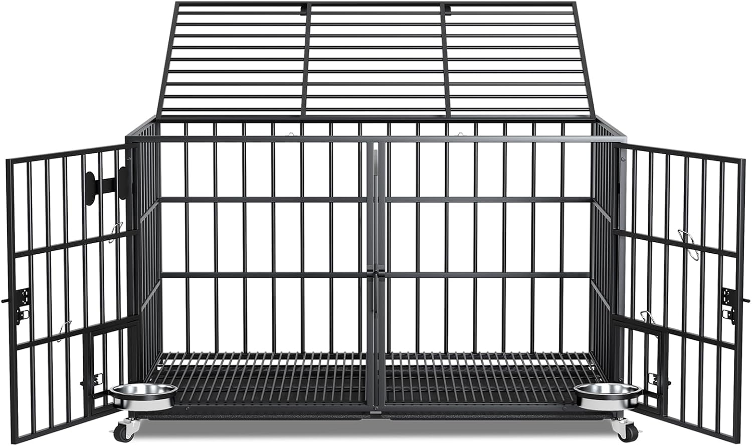 - 【Easy Access & Feeding】The dog crate has double doors and a reversible top for easy access almost anywhere. Installation usually takes only 10 minutes, including detailed instructions and installation parts.The kennel is additionally designed with 2 small feeding doors with locks.These doors allow quick and easy access to the stainless steel dog bowl, swing bowl, without having to open the front door for easy feeding. The dog kennel double door design is not only easy to get in and out of the kennel, but also good for you to interact with and feed your dog.This crate has multiple ways to open the door, so you can experiment with agility and obedience, allowing them to grow faster.