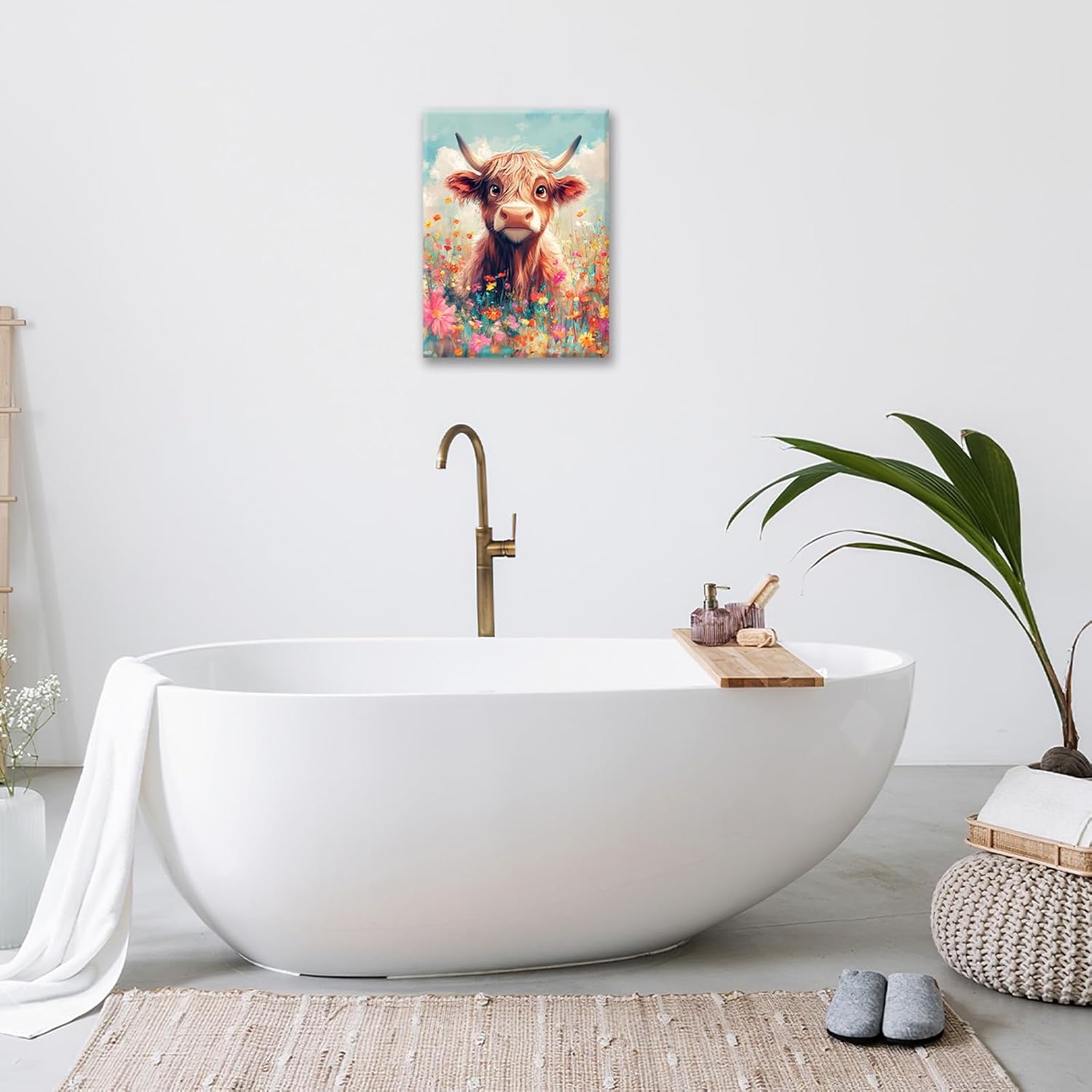 Highland Cow Wall Art Canvas Flower Cattle Wall Decor Prints Framed Painting Animal Pictures Gifts Artwork for Bathroom Living Dining Kitchen 12"x16"