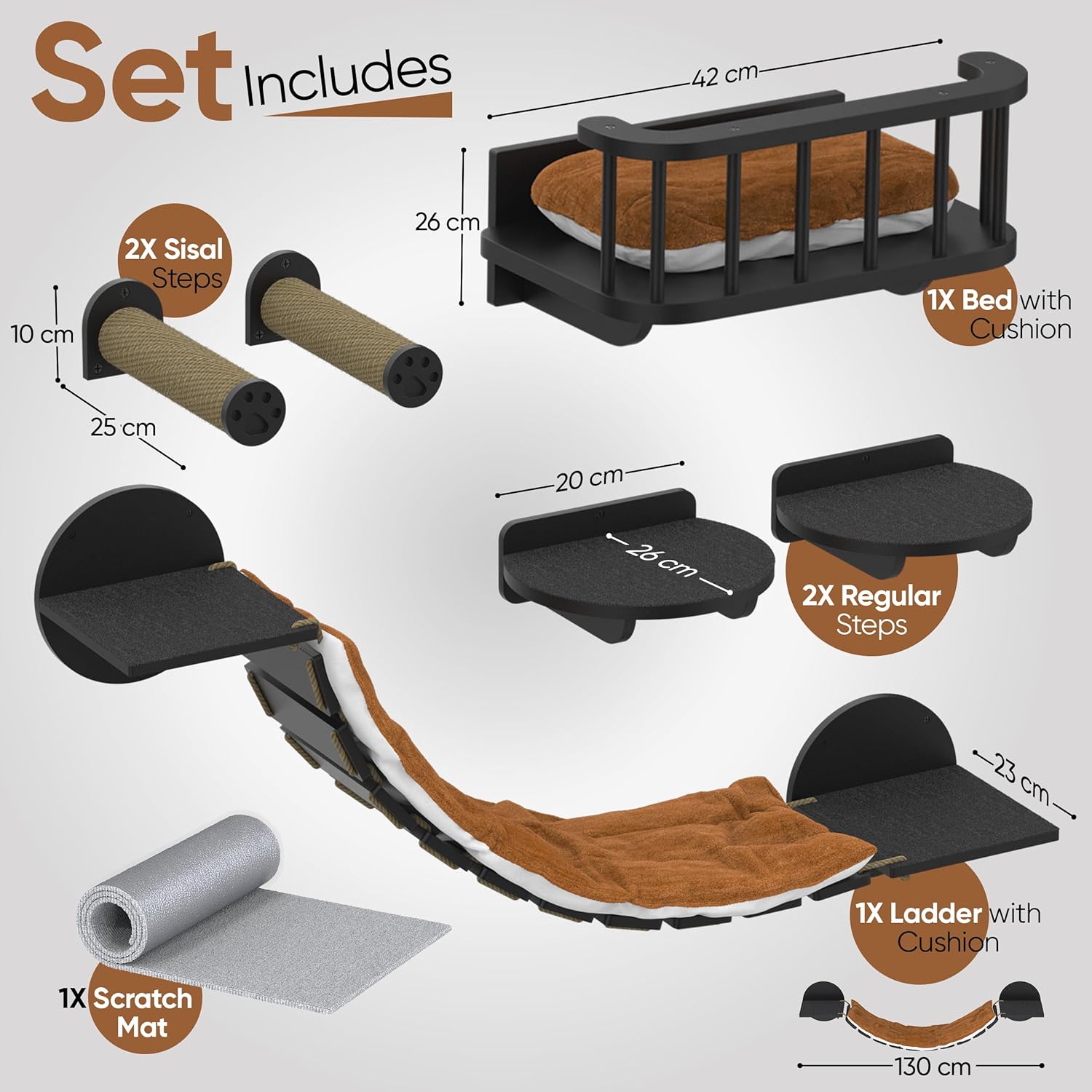 - THE COMPLETE CAT WALL SHELVES SET – EVERYTHING YOUR CAT NEEDS – Our 7-piece cat wall furniture set includes all the essentials: 2 sisal steps, 2 cat wall steps, 1 cushioned bed, 1 cushioned bridge/ladder, and 1 carpet scratch mat. Plus, all the necessary hardware and a step-by-step guide are included to make creating your cat's climbing paradise quick and easy!