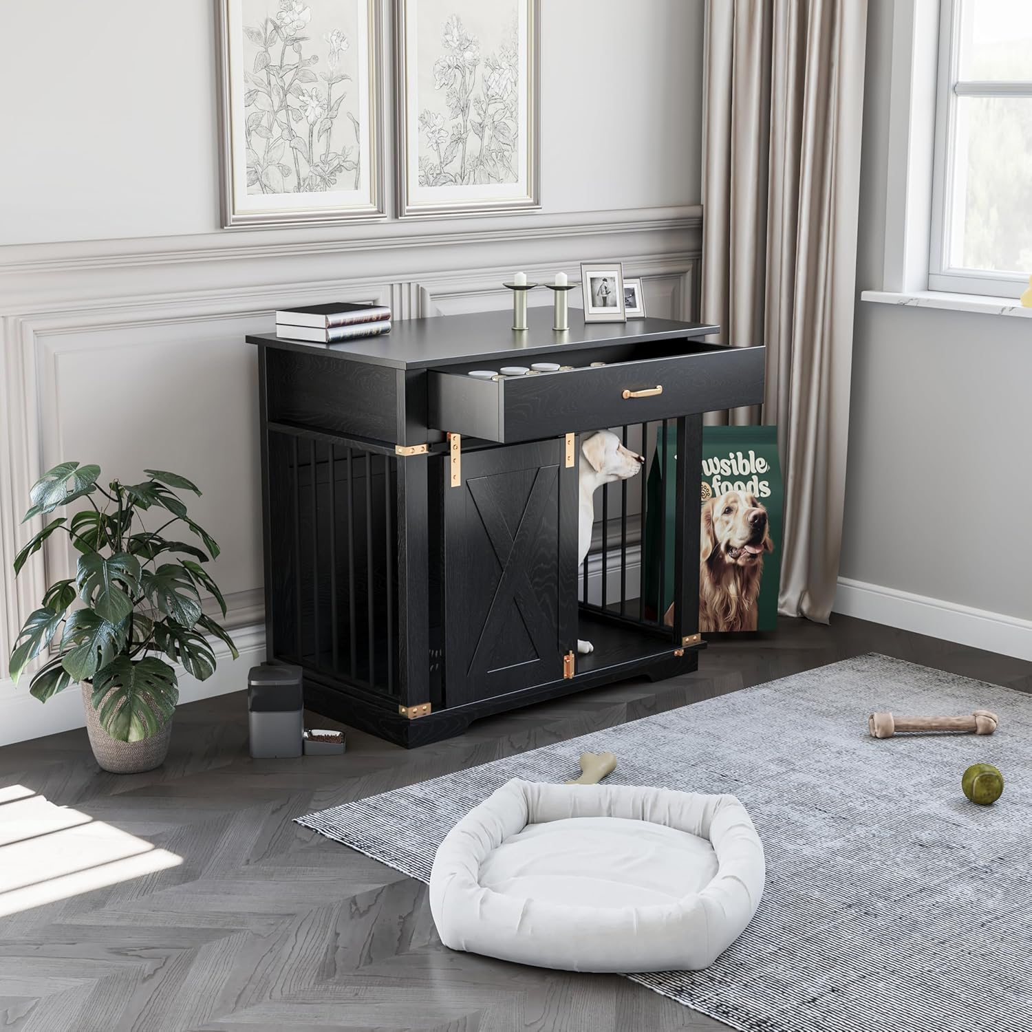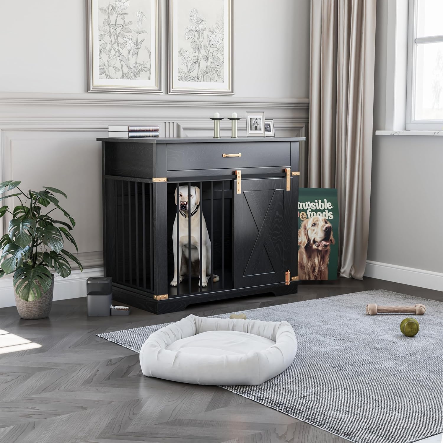 • Convenient Storage & Space-Saving Design: Equipped with a practical drawer storage area, this dog crate helps you organize your pet’s toys, food, and essentials neatly. The sliding barn door design ensures easy access while saving space, making it a perfect fit for any room.