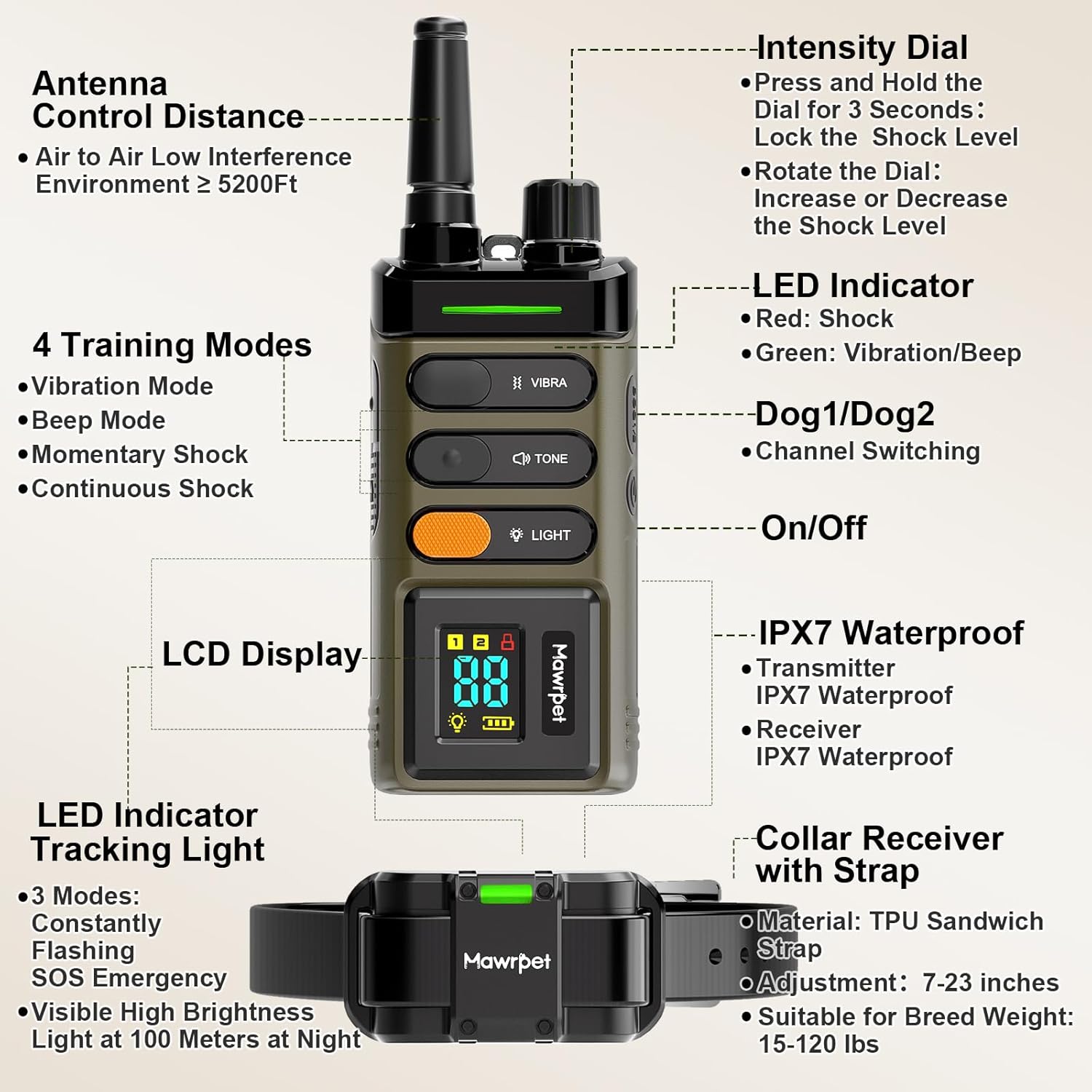 - 【5200 FT Range and Easy Storage】Mawrpet training collar has a range of up to 5200 FT, allowing you to train your dog even when you're at a distance outdoors. When you're not using the remote, you can easily attach it to your waistband for convenient carrying; you don't have to worry about losing it. The instant response safety on/off button ensures you don't have to worry about accidental touch.