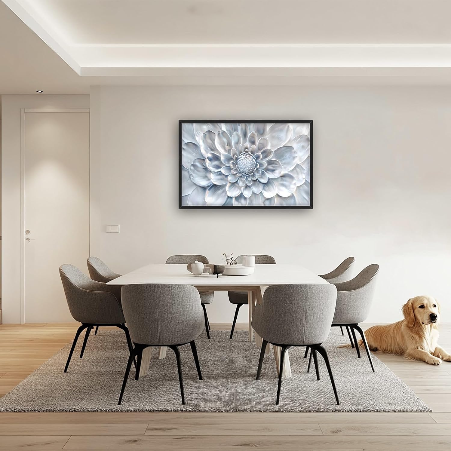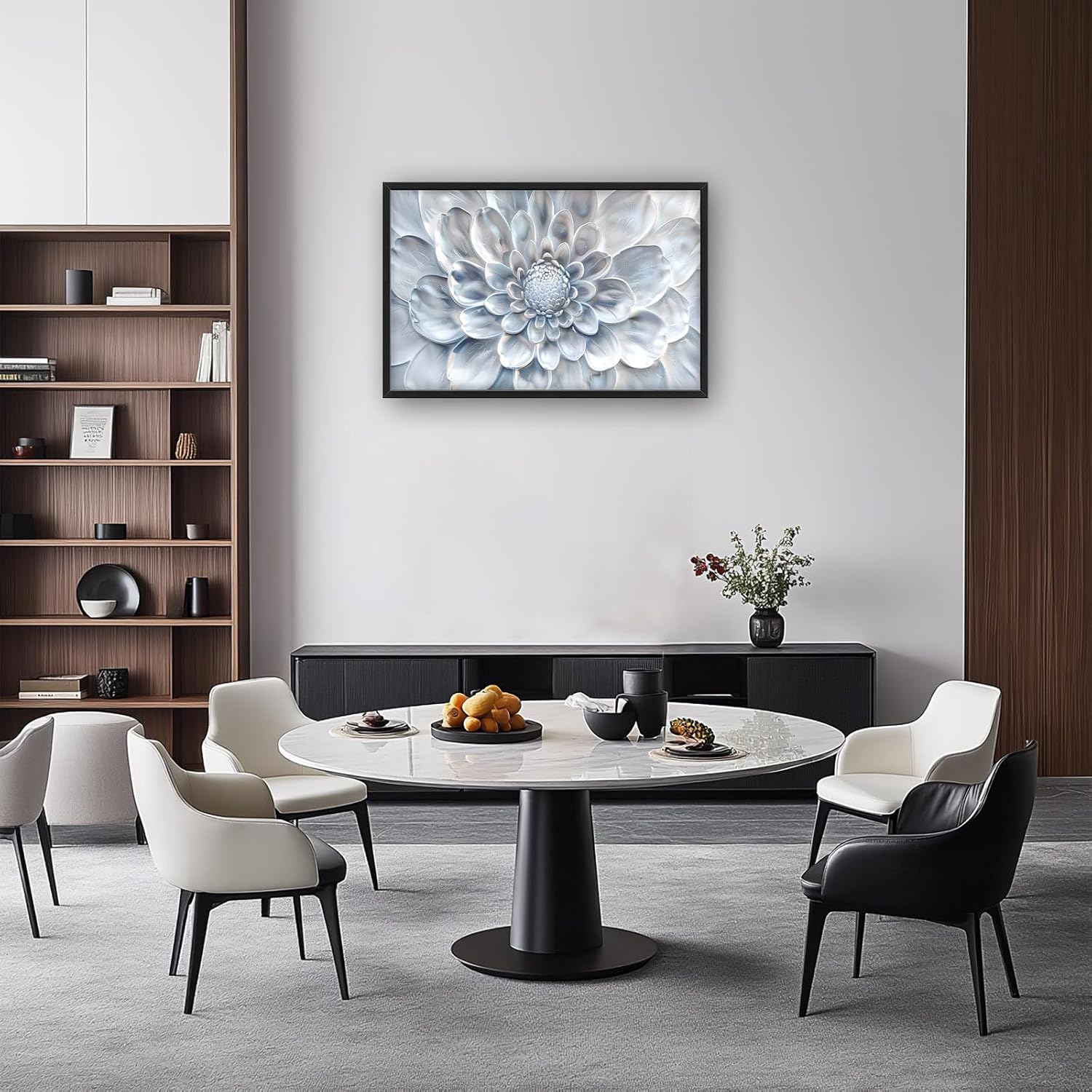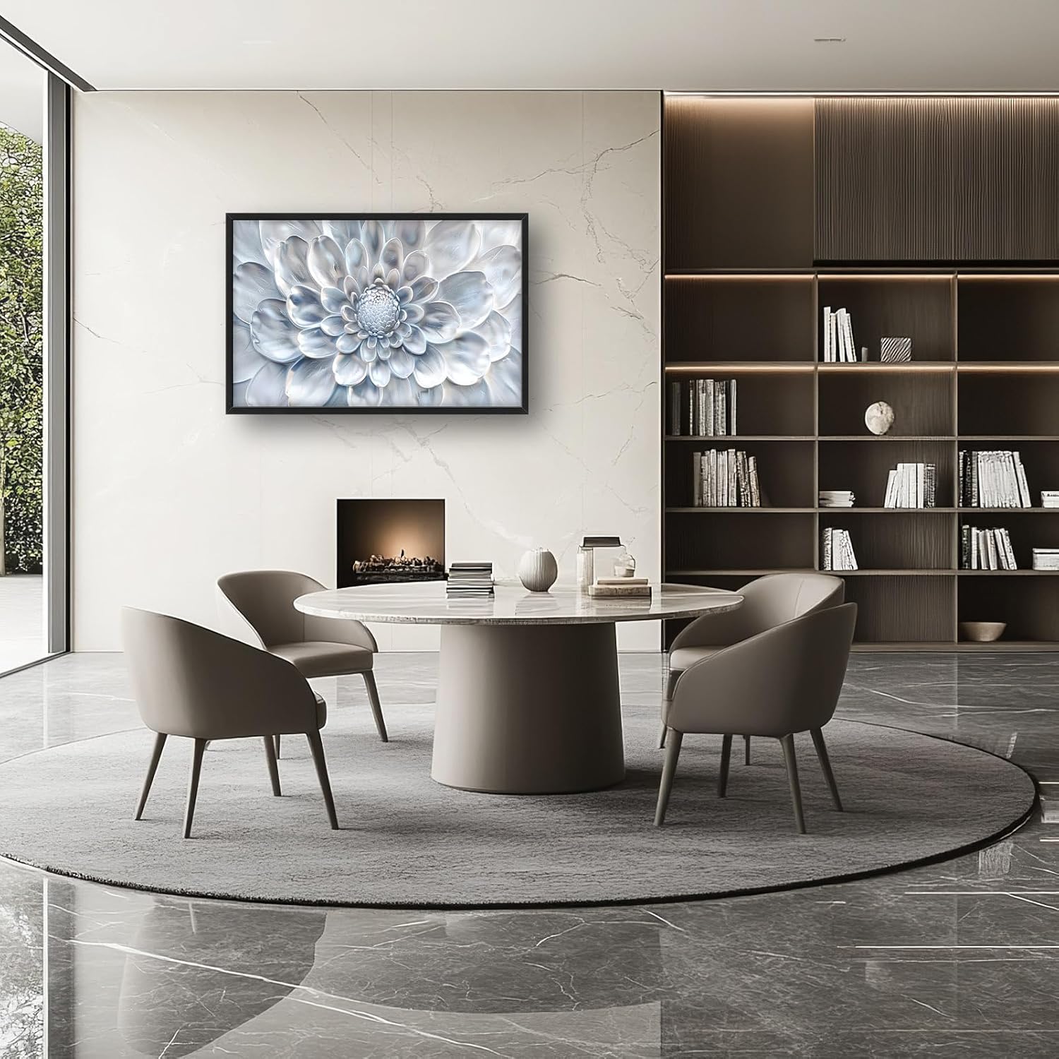• 【Unique Design】A close-up of an elegant dahlia flower, its petals rendered in soft silver tones and delicate textures, creating a sense of depth that emphasizes the intricate details of each petal. The background is a subtle gradient from light grey to pale blue, adding a touch of sophistication to the overall composition. This image captures the essence of modern wall art with a focus on realism and high-resolution detail.