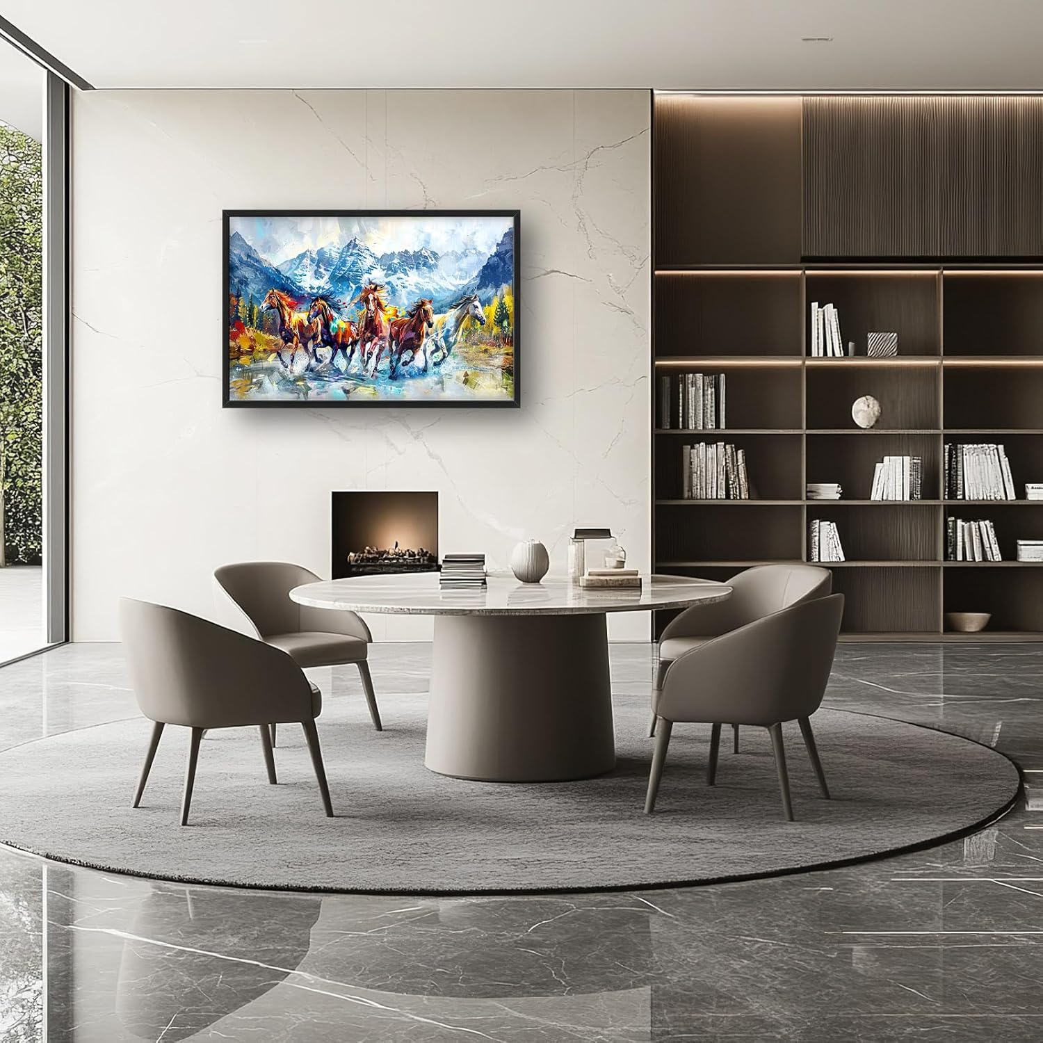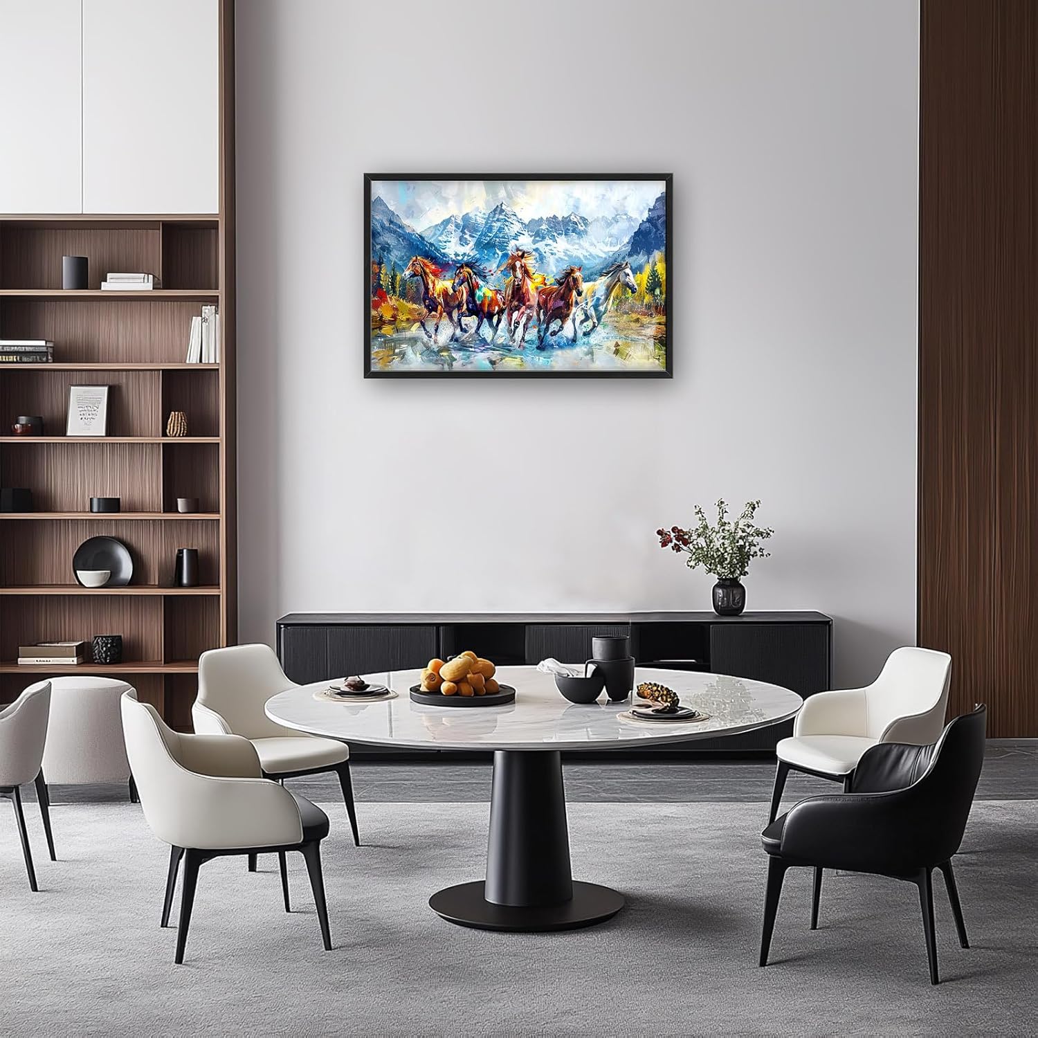 • 【Unique Design】A group of horses galloping in the mountains, with an oil painting style and colorful colors. The composition is symmetrical left to right, with clear details on each horse's face. In front view, there should be five horses running towards us, surrounded by snow-capped peaks and dense forests. The background features a flowing river with water splashing around them.