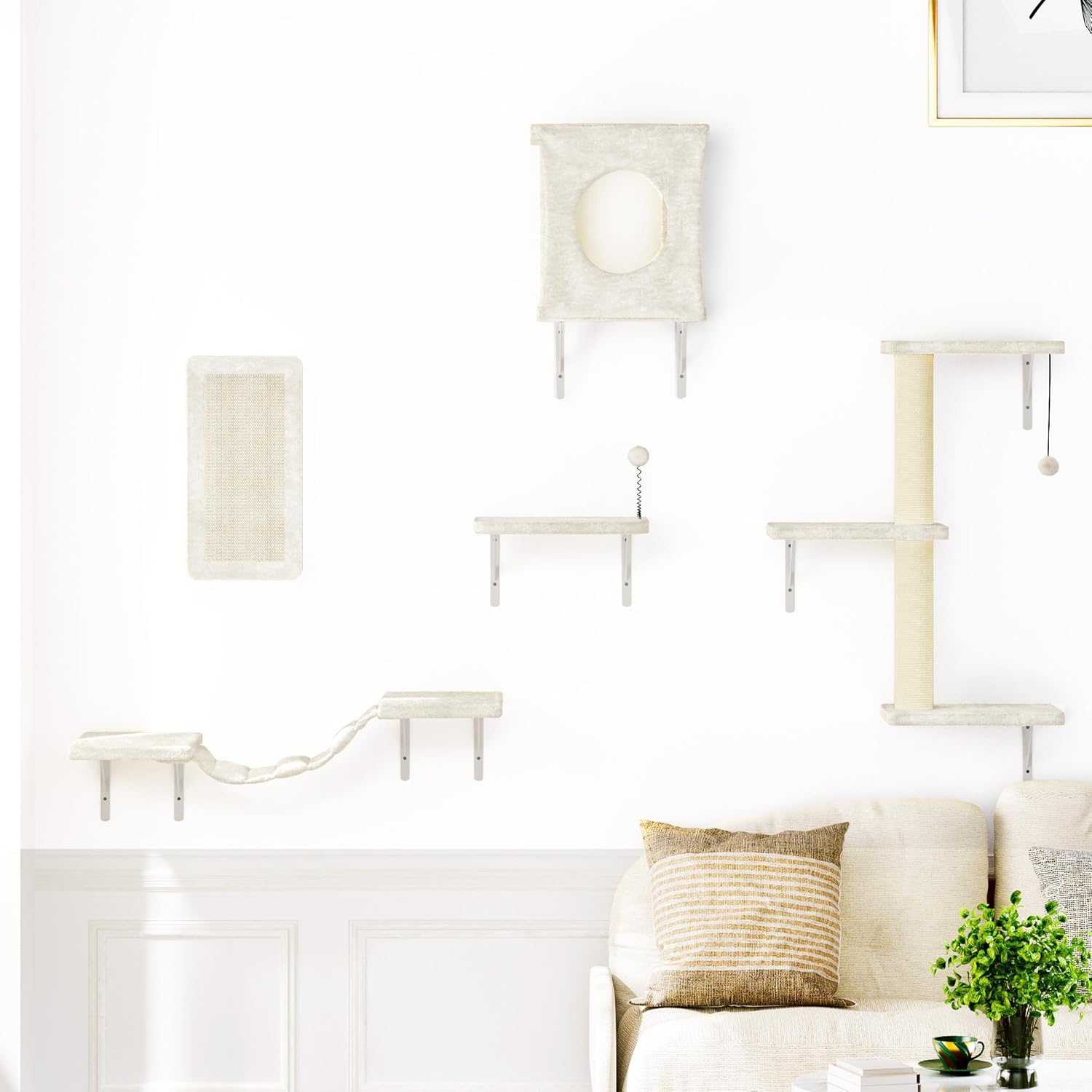 NUNU LAB Cat Wall Shelves Set, 5 Pcs Wall-Mounted Cat Climber with Condo House, Bridge Ladder, Scratching Post, Indoor Cat Furniture Set, Beige