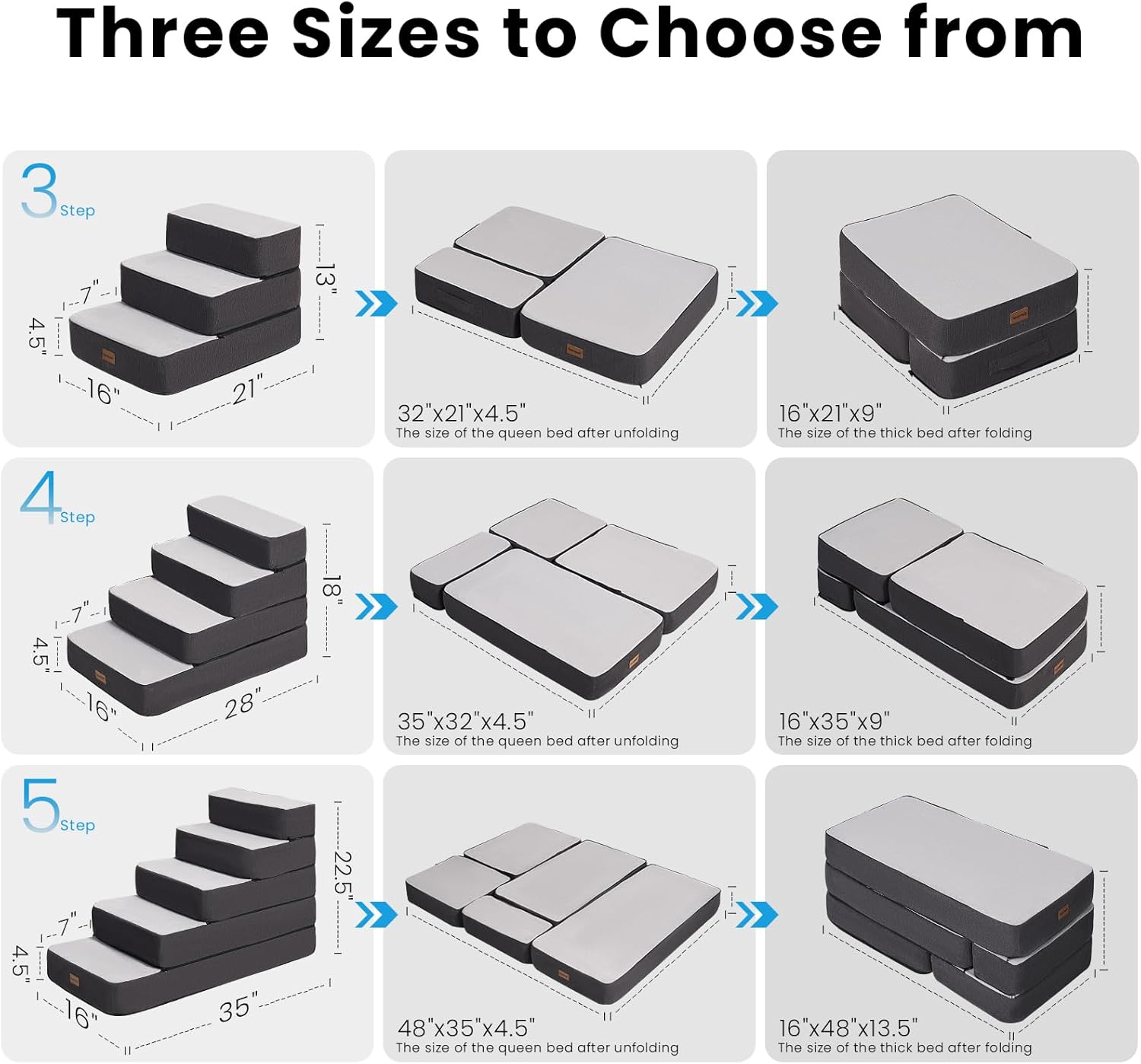 - Non-Slip Steps: 35D ultra-firm foam prevents wobbling. Anti-slip fabric on every step grips floors and pet paws, even when layers are split.