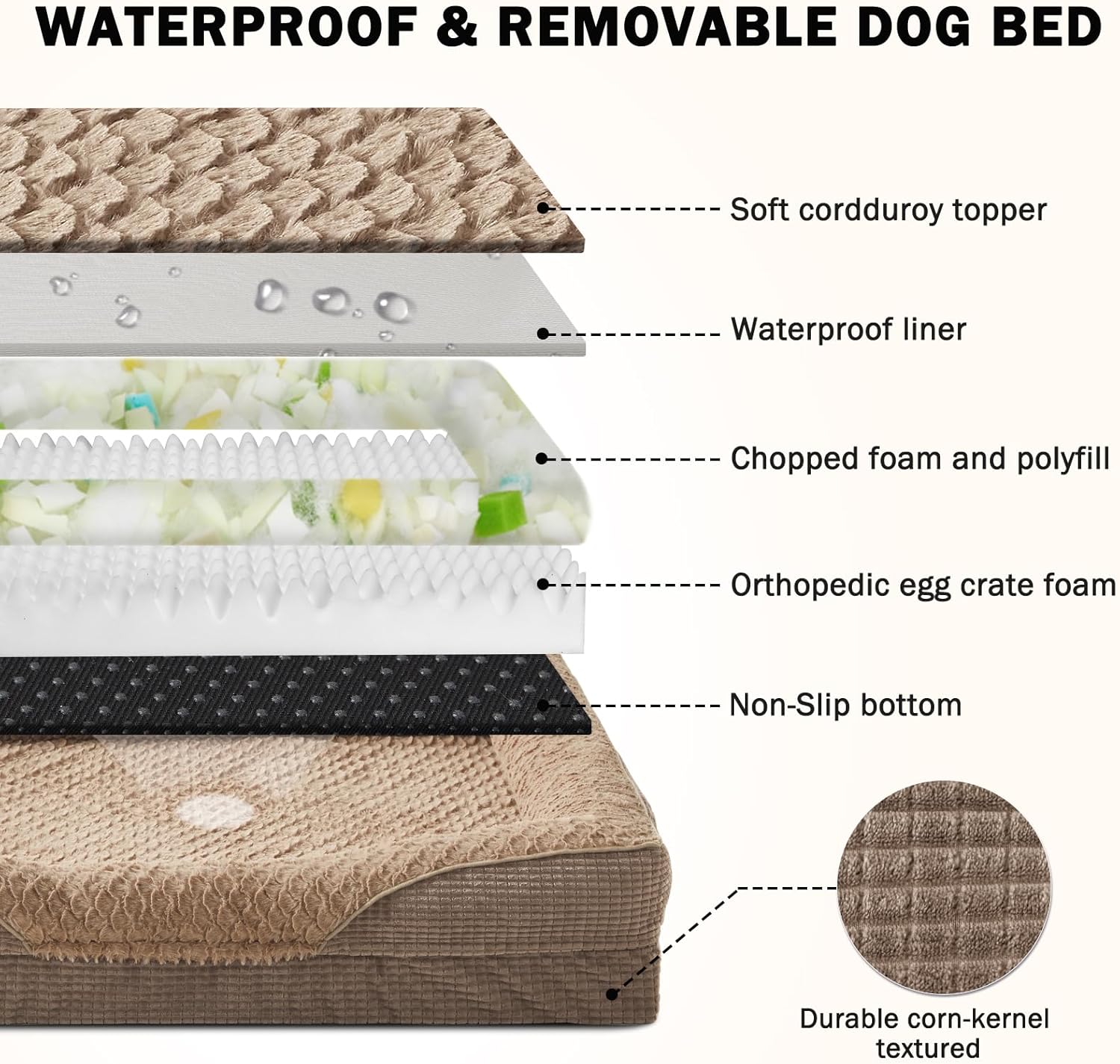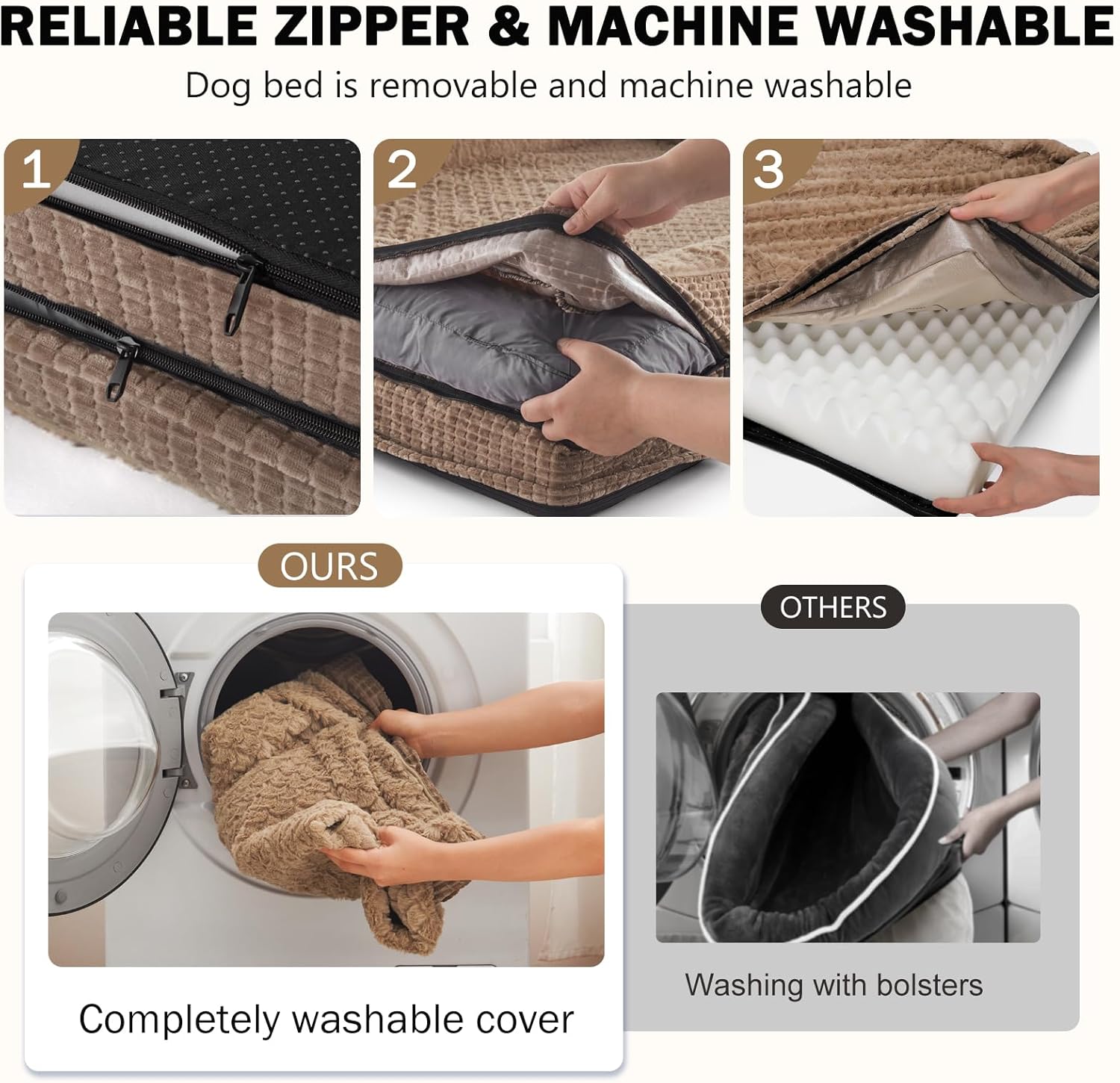 • 🐶WATERPROOF & WASHABLE DOG BED: The dog bed features a fully removable, machine-washable cover with a smooth double zipper for easy to quick remove and care, so just throw it in the washing machine and will be as good as new, ensuring your pet's space stays fresh and hygienic. The waterproof inner lining on the back of the dog bed cover fully protect the egg crate foam from spills, water damage, or accidents, prolonging the product's life.