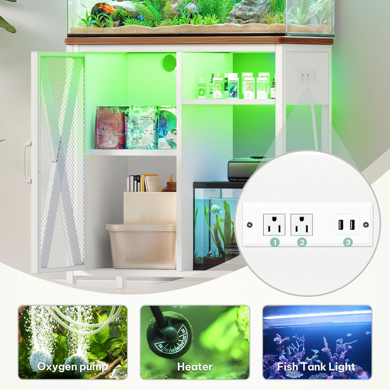 - Practical Functionality: Enhance your fish tank setup with integrated power outlets for easy electronic device connections. No extra tools required, simplifying the management of lights, heaters, and oxygen pumps