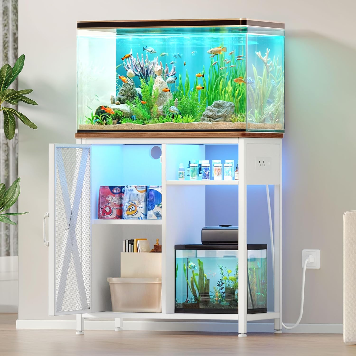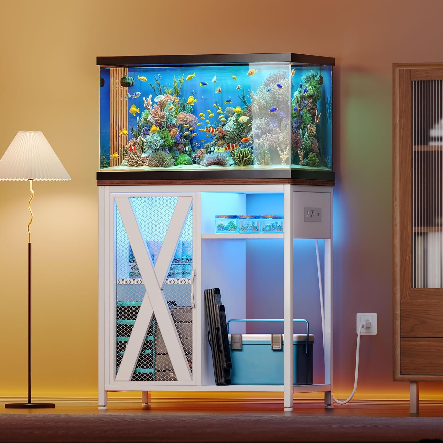 - Smart LED Lights: Enhance Your Aquatic Oasis with Our Captivating Aquarium Stand. Featuring Mesmerizing LED Lighting with RGB Customization, immerse yourself in a tranquil ambiance that can be tailored to suit any mood or occasion. Keep water away from outlets & led lights when turned on to prevent damage
