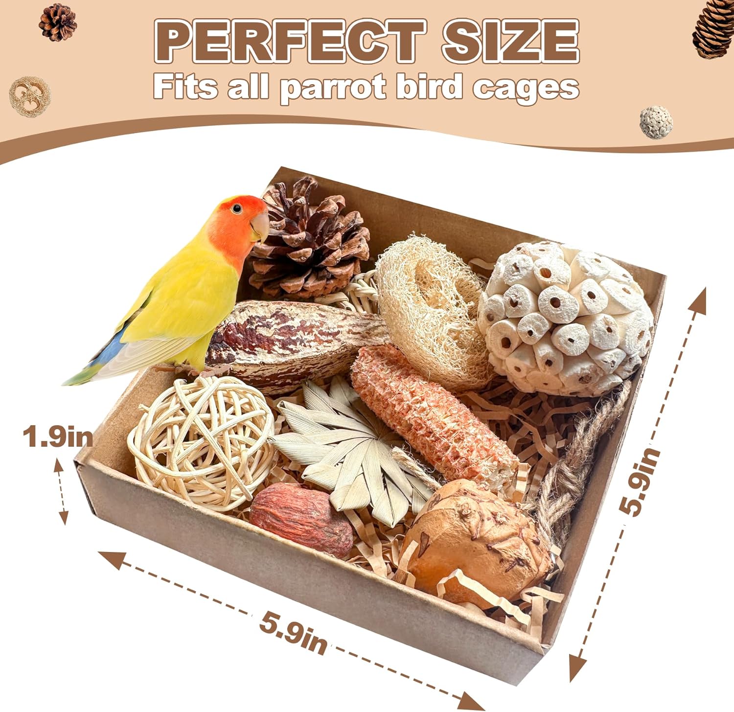 - 🌿 IGNITE NATURAL FORAGING INSTINCTS: The Crimson-bellied Conure toys for medium birds unleash their inner explorer! From crinkly loofah sponges to rugged pine cones with wooden pegs, each piece in our 10-piece set mimics nature’s puzzles. Watch them peck, shred, and problem-solve—turning snack time into a jungle survival challenge