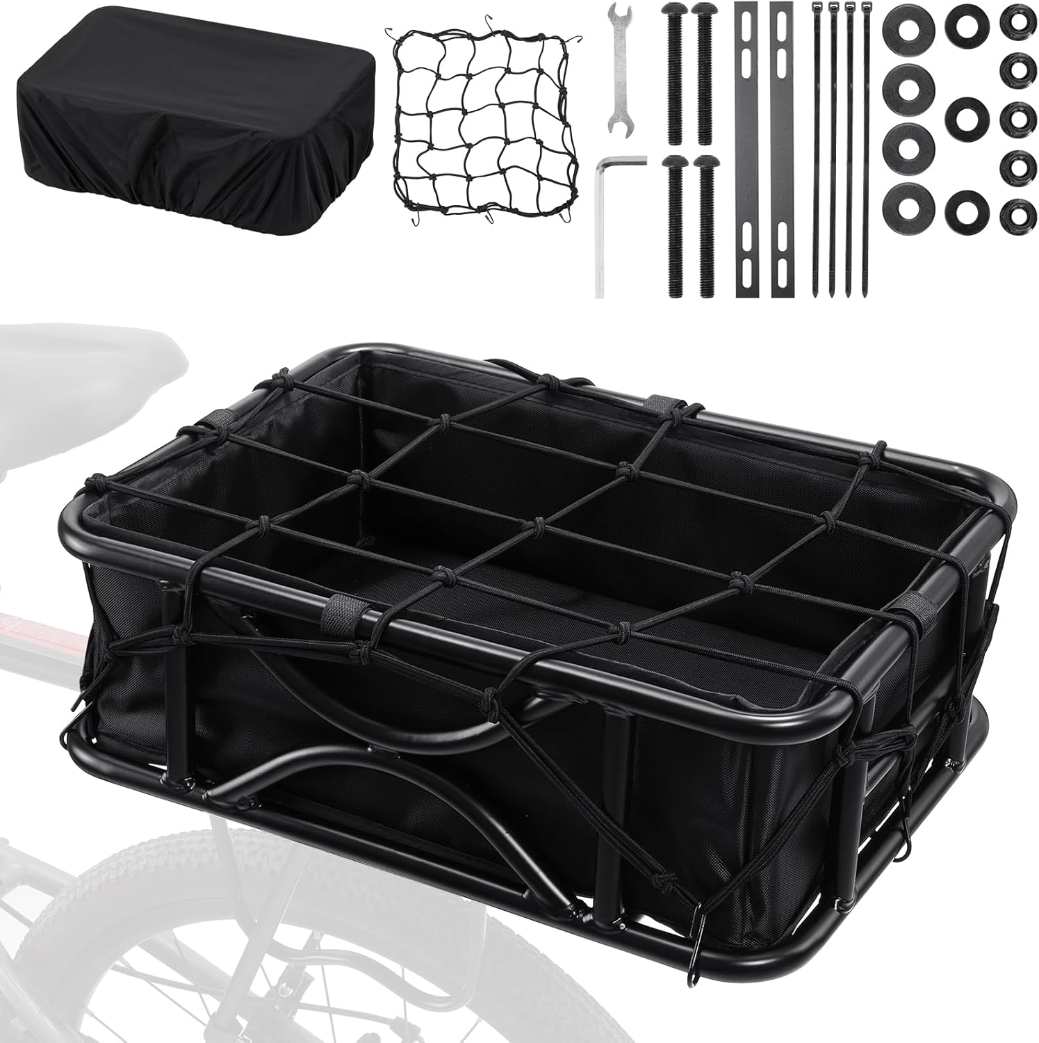 - High Capacity & Versatile: Bike cargo rack basket with large capacity (46x32x15cm) to carry groceries, small pets, and more. Includes an Oxford cloth liner bag, waterproof cover, and cargo net.