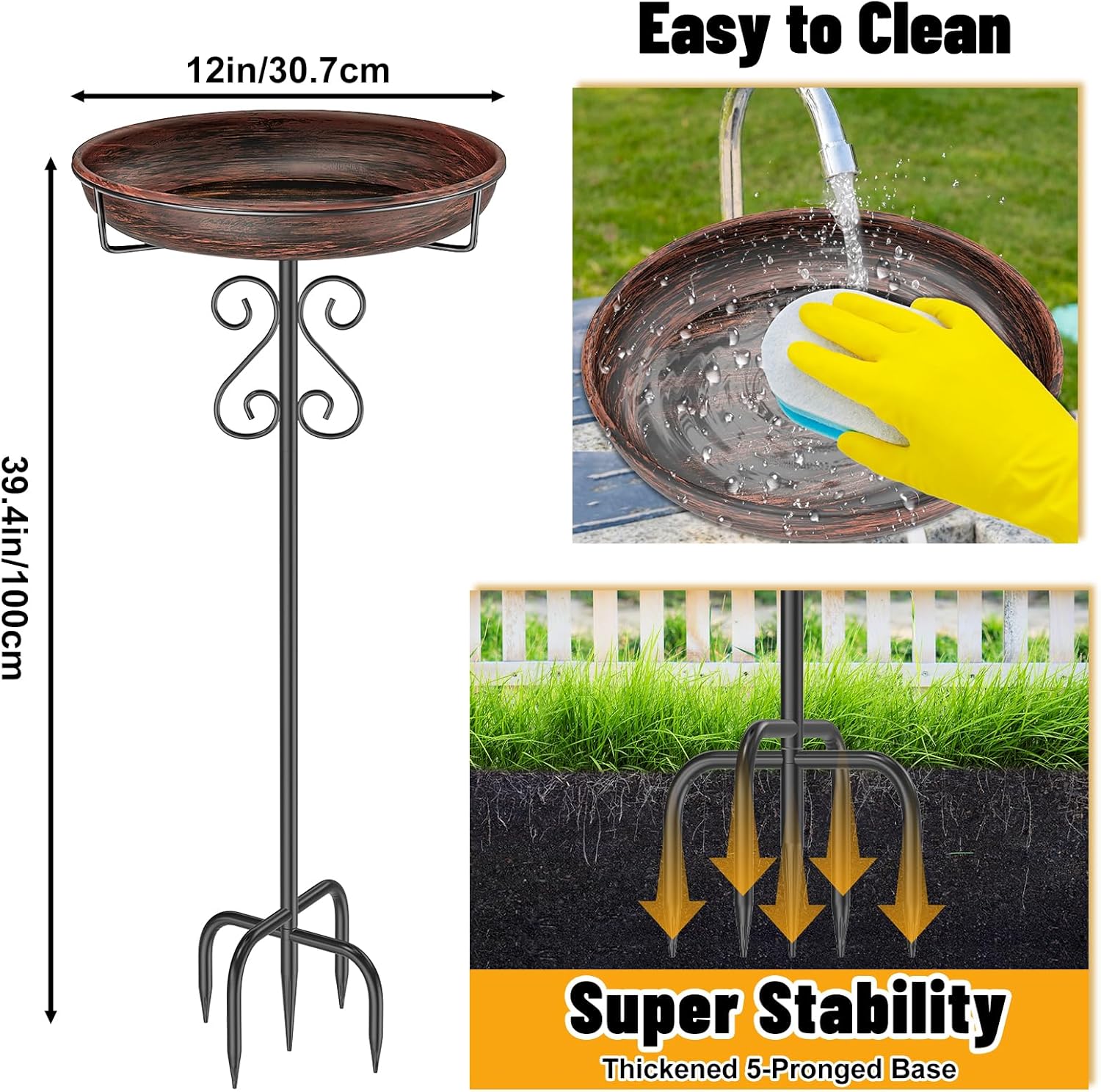 - Upgraded 5-Pronged Base: The upgraded 5-pronged base of the bird bath evenly disperses the load bearing force and increases the contact area with the ground, with the thickened metal stakes and safety anti-rust coating to ensure that the bird bath can be stable and upright, long-lasting and durable