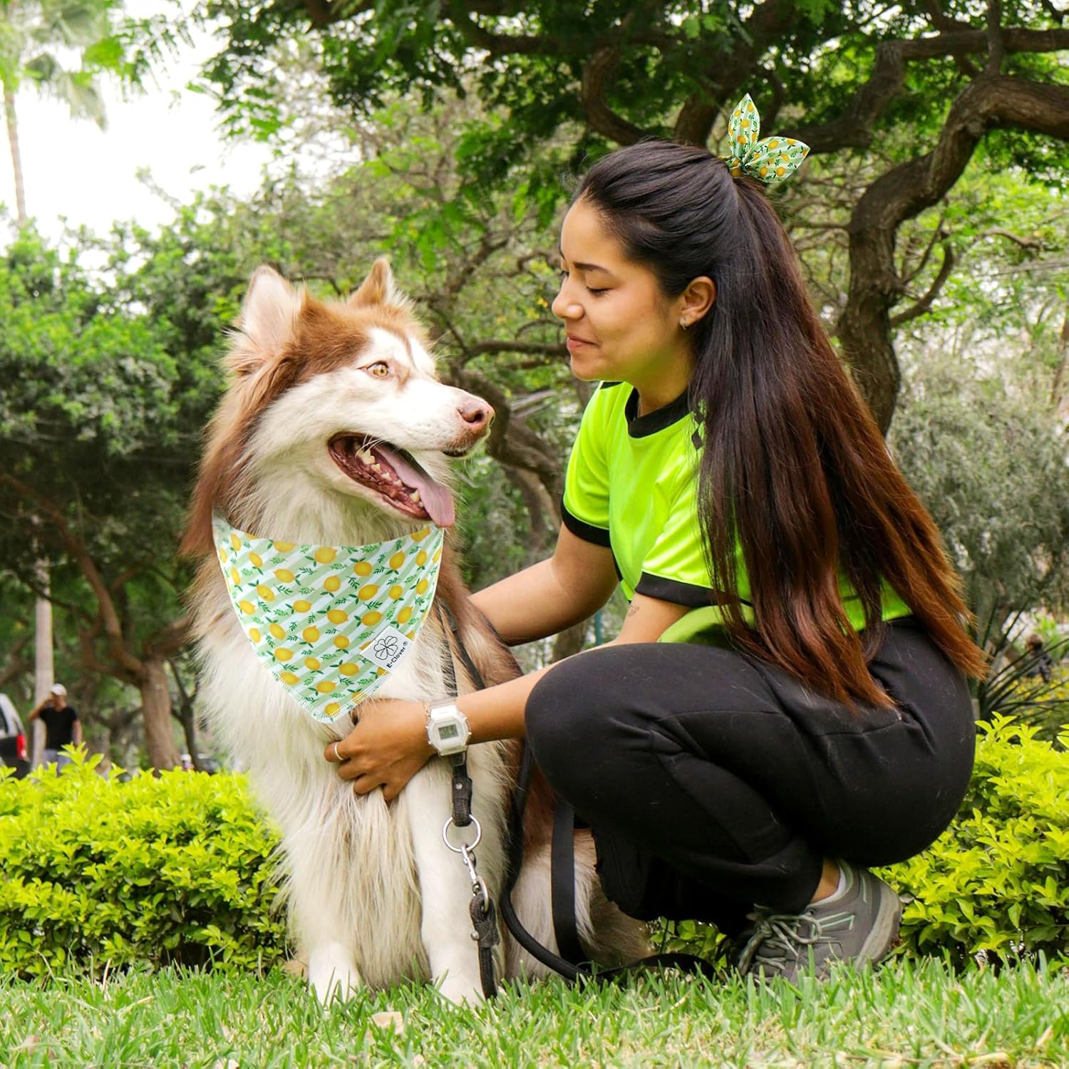 - Matching Bandana and Scrunchie Set: It’s full of love when your pets is wearing the summer theme bandanas and you are wearing the bow scrunchies. When traveling, sleeping, taking photos or daily warking, adorable dog bandana and scrunchie is a pretty accessories. The the hair tie can be worn as a wrist accessory and hold your hair. Beautiful dog drool bibs and scrunchie with lemon pattern, it’s nice photo props.