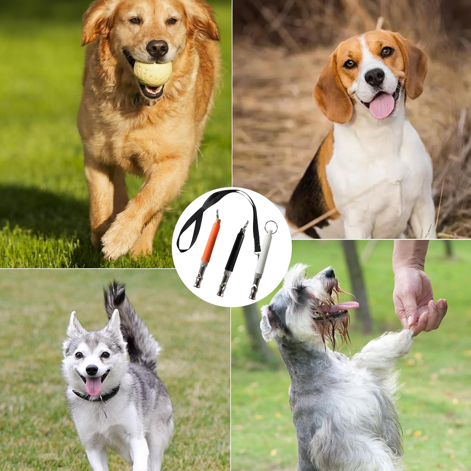 - Package Contents: You will receive 3 dog whistle to make dogs come to you in different colors (black + white + orange) and three lanyards, which are sufficient to meet your daily use needs. When your dog or your neighbor's dog keeps barking, gently blow the whistle for dogs, and the ultrasonic frequency it emits can easily attract the dog's attention and stop it from barking.