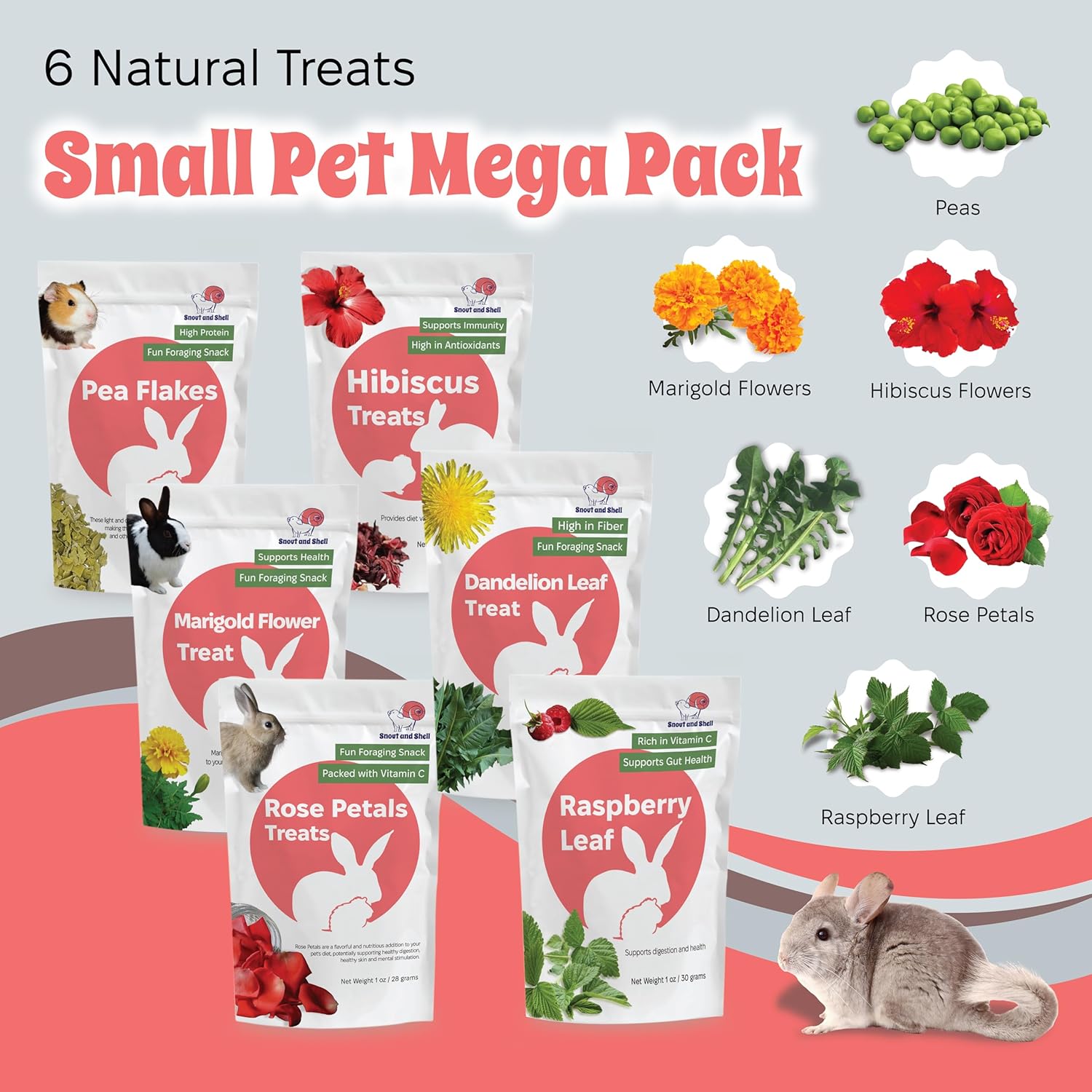 - 6-in-1 Natural Treat Mega Pack – Includes Pea Flakes, Dandelion Leaf, Raspberry Leaf, Marigold, Rose Petals, and Hibiscus – a complete foraging and wellness snack bundle for rabbits, guinea pigs, chinchillas & more.