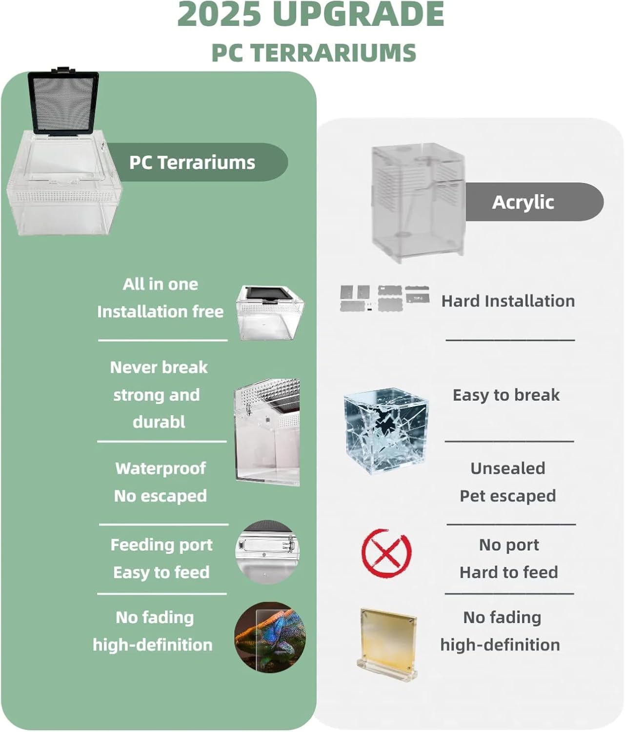 - 【No Assembly Required】:the tank forms a one-piece, waterproof structure—no assembly required. The front magnetic feeding window simplifies feeding routines while ensuring an escape-proof design, ideal for hermit crab enclosures, jumping spider enclosures, and other small reptile habitats.