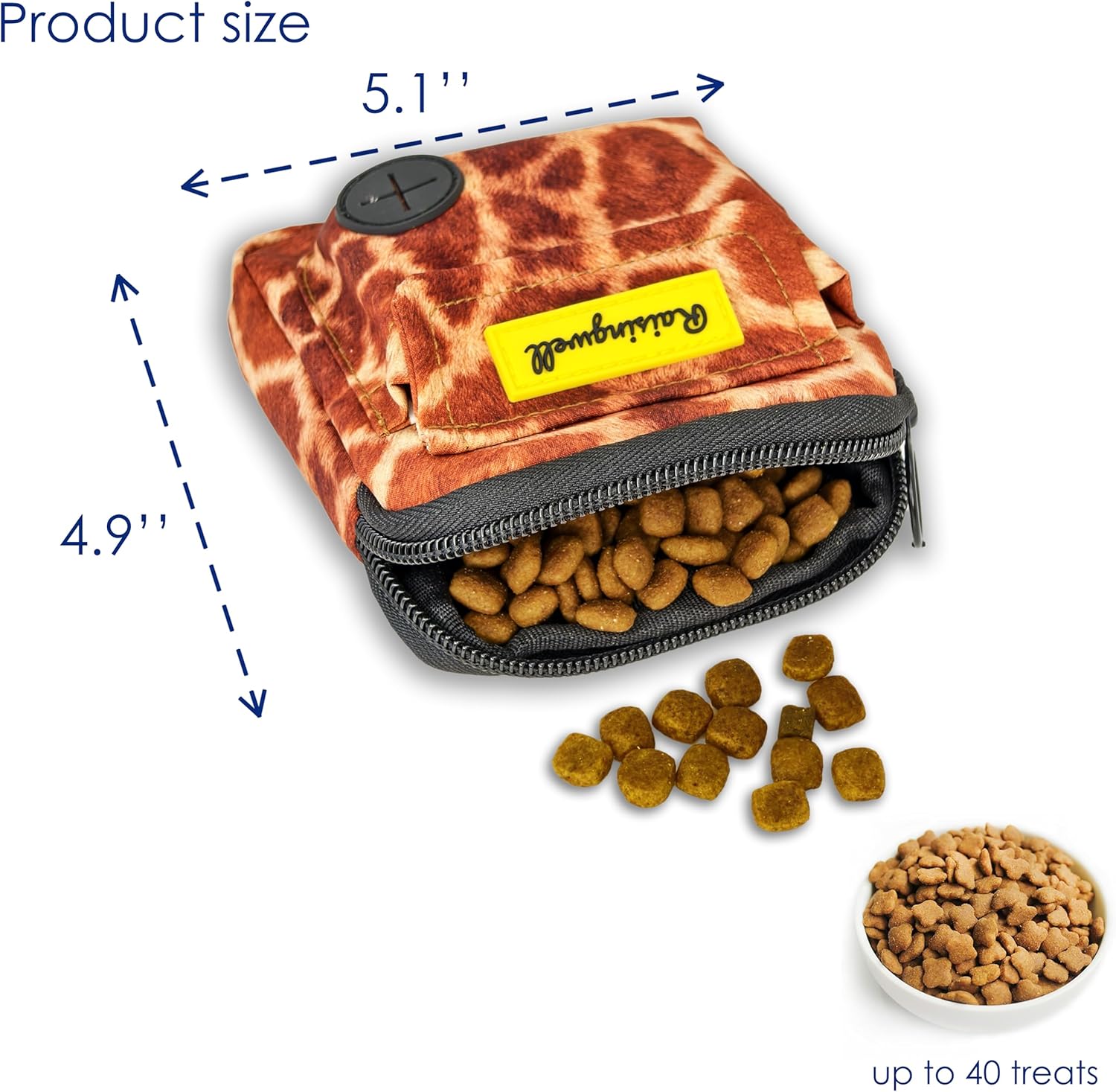 • Raisingwell Dog T1、Fashion Design: This dog training treat bag measures 4.9 x 5.1 inches and offers versatile wearing options. It comes equipped with a carabiner and a strap, allowing you to hang it on your leash, attach it to your pet's collar, or even wear it as a trendy accessory on your bag. The bag features a zipper closure, ensuring that treats stay secure inside even when you're playing with your pet afterward. It's perfect for carrying around or using during short outings.reat Pouch