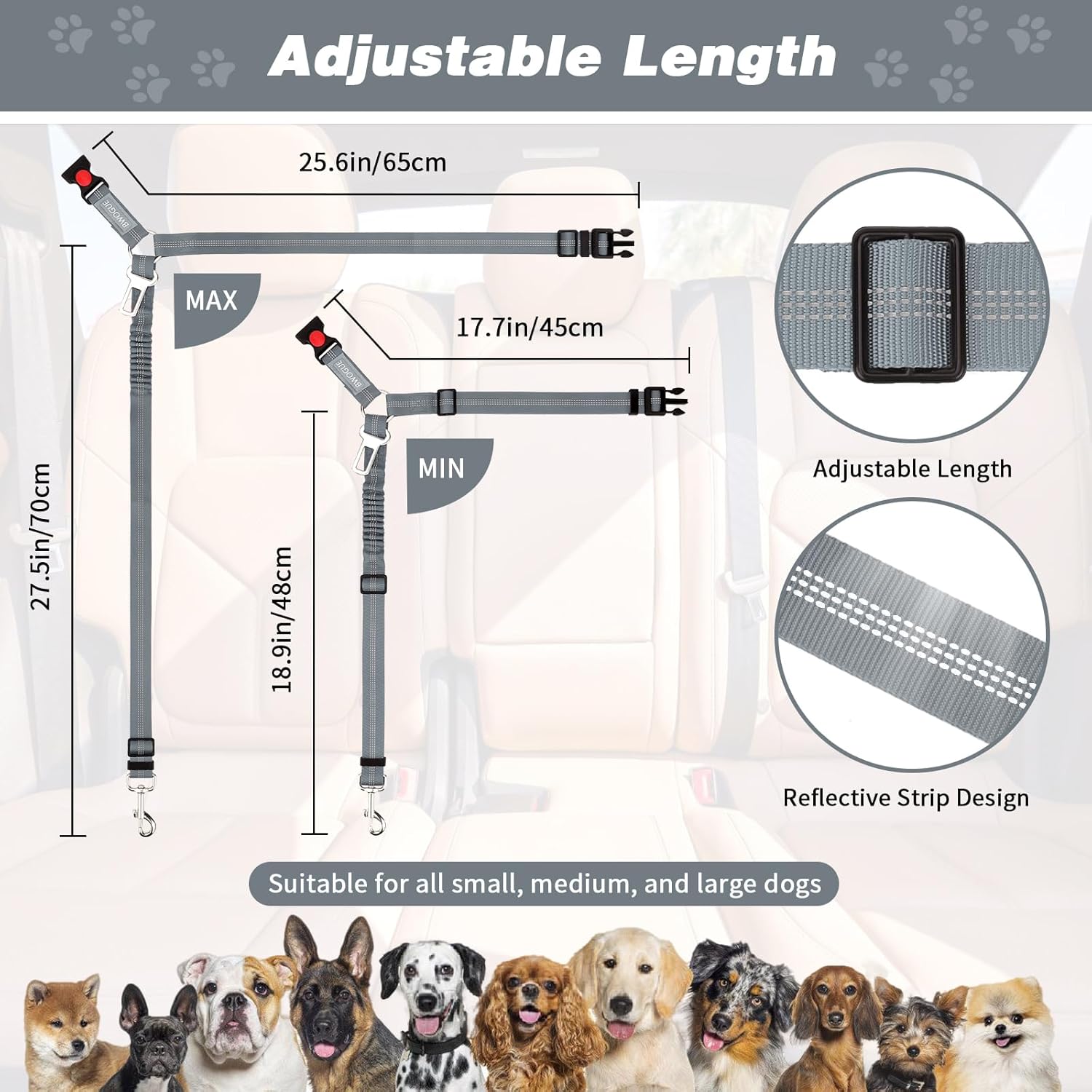 - Adjustable for All Sizes: Dogs come in different sizes and weights. The Headrest Restraint is adjustable between 18-30 inches, you can easy to adjust the dog leash to the suitable length to keep your pet in a safety state. Works for most sizes: small, medium, and large dogs