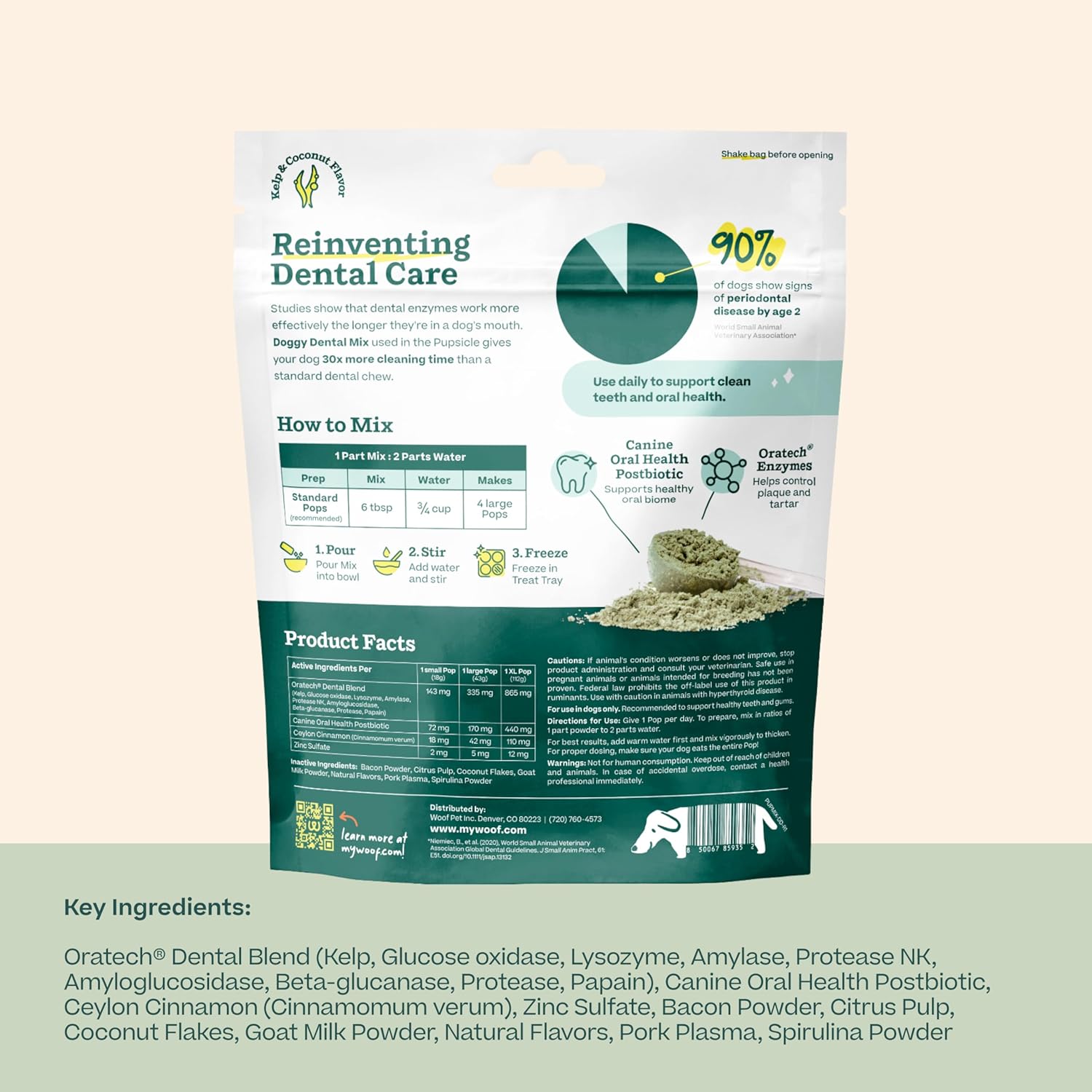 - Powerhouse Dog Dental Powder: Over 80% of dogs face dental issues by age 3, but our Doggy Dental Pupsicle Mix helps control plaque and tartar with daily use. Powered by the Oratech blend, it supports a balanced oral microbiome. When used with the Pupsicle, it extends chew time, giving the dental enzyme cleaners more time to work—making dental dog cleaning a fun part of your pup’s routine.