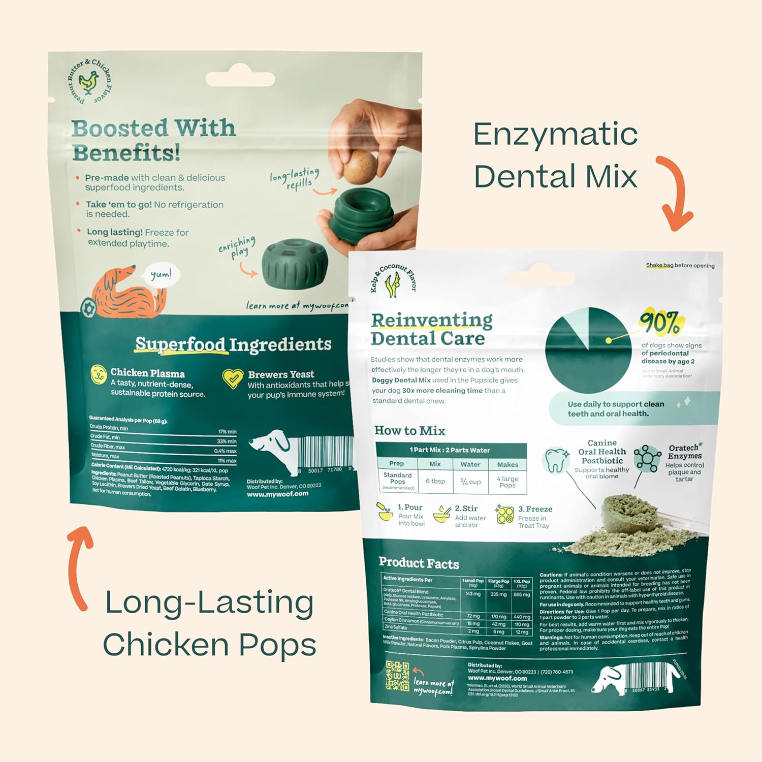 • The Daily Dental Solution: These dental dog pops are made with postbiotics to help maintain a healthy oral biome. Offer your dog a daily pop to support dental health and provide nourishing enrichment.
