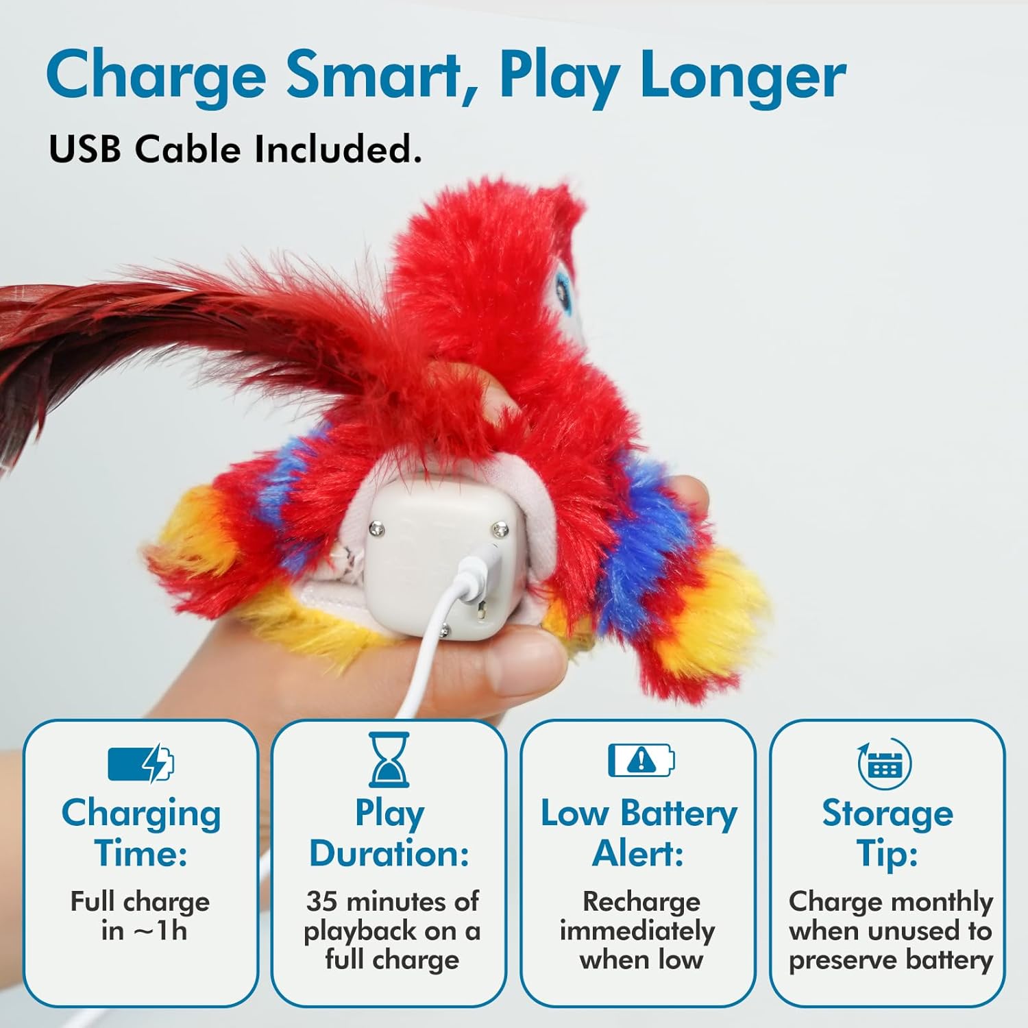 • 【Flapping Bird Cat Toy】The Bird Does Not Fly! Make play fantastic with the touch-activated cat bird toy, which makes lifelike chirping sounds and flapping once playtime begins, beckoning every cat, bite, chew, and chase! Every 20 seconds of operation, chirping bird cat toy will automatically stop, it can be restarted by beating the bird's wings.