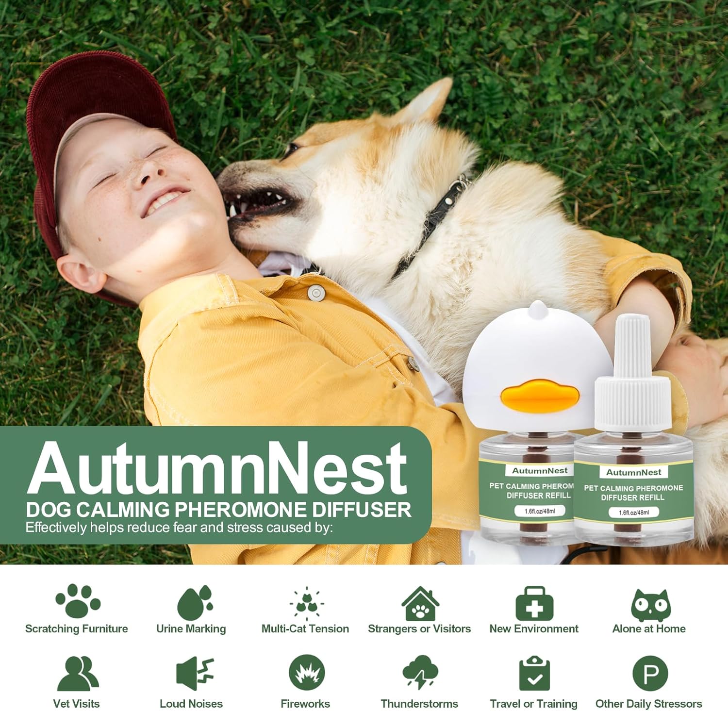 - 【4-in-1 Dog Calming Diffuser Kit – Ideal for 90-Day Stress Support】 AutumnNest calming kit includes 1 plug-in diffuser and 3 x 48ml refills, providing up to 90 days of continuous stress relief for your dog. Designed to help reduce anxiety-related behaviors like pacing, whining, and barking, this long-lasting system is ideal for maintaining a peaceful environment at home.