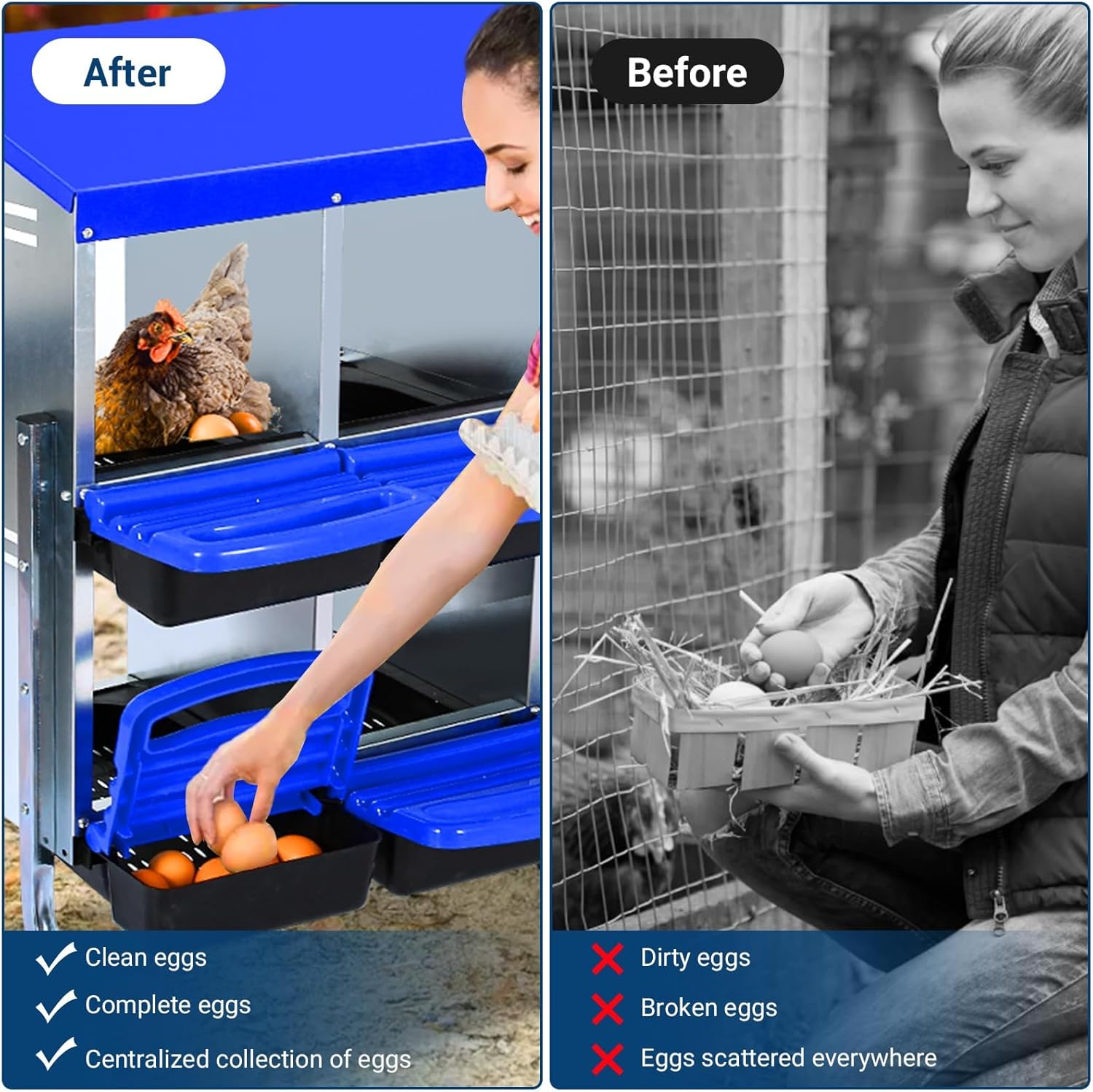 - EFFICIENT EGG COLLECTION SYSTEM: Featuring a gentle incline, our innovative design allows eggs to roll into a conveniently accessible tray. This eliminates the need to reach into the nesting area, streamlining your egg collection routine and ensuring a clean, hassle-free harvesting experience.