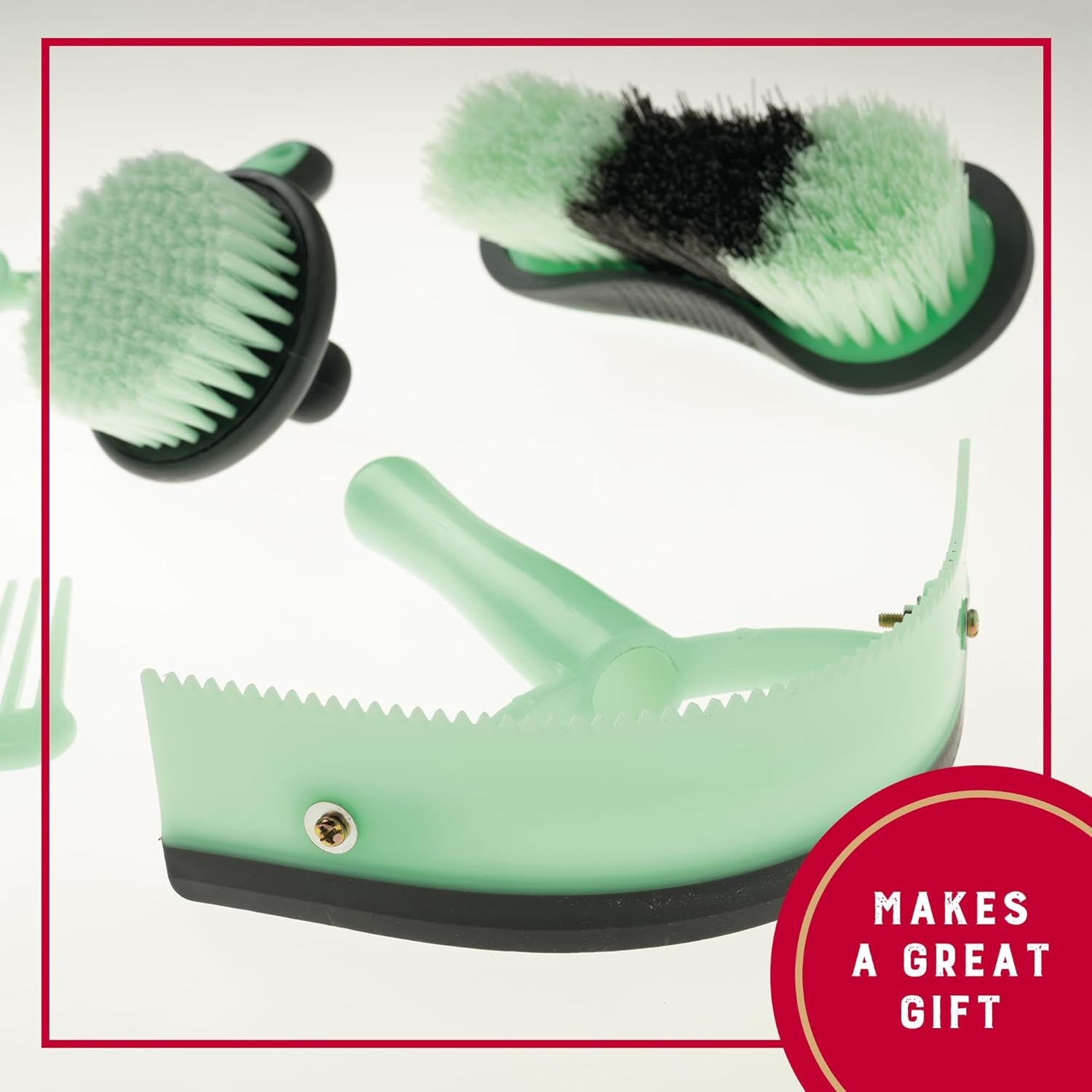 - Horse Grooming Kit: Ensure effortless cleaning and grooming of your horses with our horse grooming set; these 6-piece horse essentials include a comb, hoof pick, palm-held brush, mane and tail brush, dandy brush, and sweat scraper/coarse curry combo