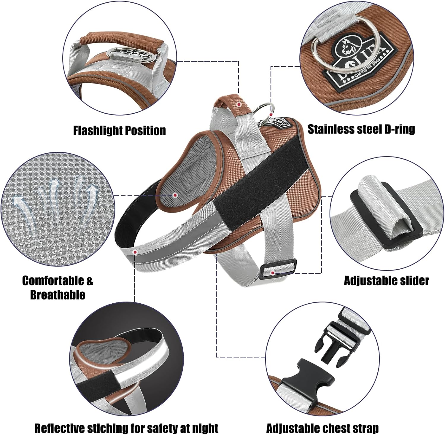 - OUTDOOR HEALTHY: Puppy no pull dog harness with reflective straps to ensure your dog is highly visible and keep dogs safe at night. You can connect the dog leash on the D-ring and with handle is easy to control on crowded streets. The high-end pet harness is perfect for daily walking, running, hiking, training, hunting, outdoor adventure and more!